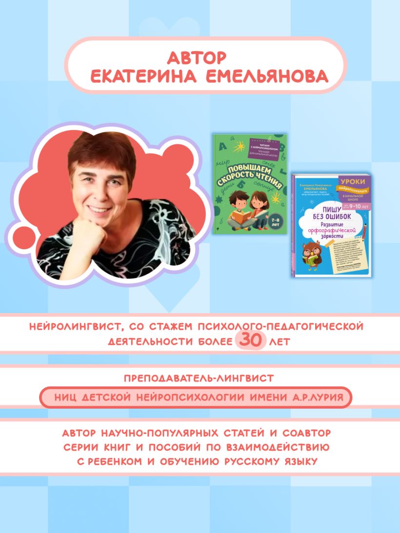 Пособие по развитию навыка грамотного письма от издательства «Эксмо» подготовлено практикующим нейропсихологом, который каждый день помогает учащимся начальной школы справиться с проблемами, возникающими в обучении. Цель книги — повысить общую грамотность учеников 3—4 классов. Нейротренажер разделен на главы по отдельным правилам. Сами правила русской орфографии сформулированы в стиле рэп. Их можно не только читать, но и пропеть и протанцевать — так будет легче их понять и запомнить. Во главу угла поставлен метод обведения букв по контуру, который дает очень высокий результат, одновременно корректируя почерк, формируя образ слова и активизируя моторную память. Вопросы и задания каждой темы выстроены в определенном порядке, что способствует активизации механизмов соответствующих отделов мозга и обосновано нейропсихологически. Внутри глав имеются забавные стихотворные тексты, к каждому из которых дается несколько несложных заданий. Ко всем упражнениям, кроме творческих, имеются ответы, позволяющие учащимся проверить уровень своих знаний. Использование тренажера в качестве дополнительного материала поможет ребенку своевременно устранить всевозможные сложности в усвоении школьного материала и формировании необходимых навыков. Кроме того, в серию «Уроки нейропсихолога в начальной школе» входят книги: «Развитие разных видов памяти и внимания: для детей 8—10 лет», «Исправление почерка и профилактика дисграфии: для детей 8—10 лет», «Пишу без ошибок. Развитие орфографической зоркости: для детей 9—10 лет», «Решаю быстро и правильно. Сложение и вычитание: для детей 7—8 лет», «Развитие математических способностей и навыков: для детей 9—10 лет», «Говорю грамотно. Развитие речевого потенциала: для детей 8—10 лет».