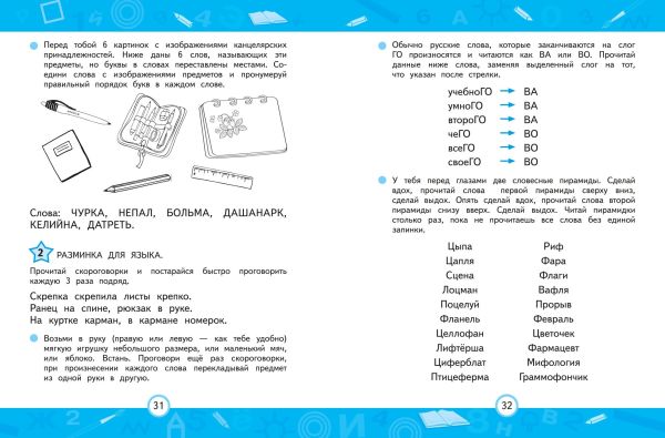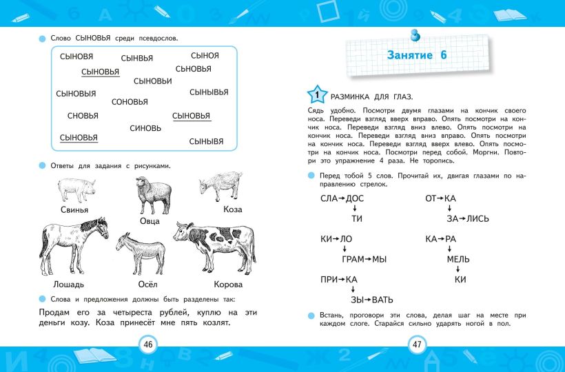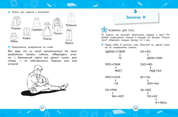 Пособие позволит сформировать навык быстрого чтения, улучшая работу артикуляционного аппарата, развивая представление о пространстве и образе слова, совершенствуя зрительное восприятие, улучшая чувство ритма и контролируя дыхание. Все упражнения внутри каждого занятия построены по принципу от простого к сложному, поэтому, чтобы достичь успеха, выполнять их нужно в предлагаемой последовательности. Что-то будет даваться легко, что-то сначала покажется трудным, но упорный труд и старание обязательно приведут к отличному результату.