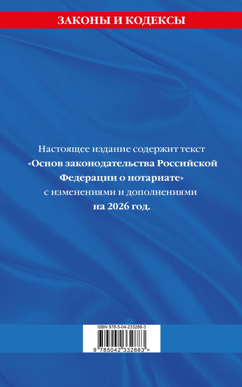 Настоящее издание содержит "Основы законодательства Российской Федерации о нотариате" и учитывает все имеющиеся изменения и дополнения на 2026 год. В данной книге приводится вся актуальная информация на дату подписания издания в печать.