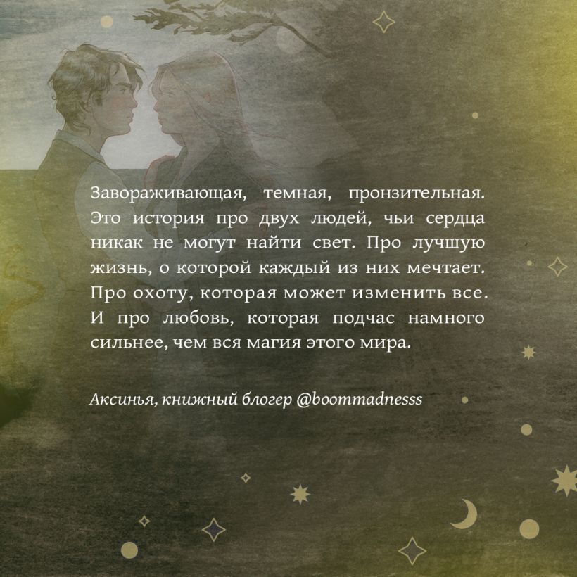 «Завораживающая, темная, пронзительная. Это история про двух людей, чьи сердца никак не могут найти свет. Про лучшую жизнь, о которой каждый из них мечтает. Про охоту, которая может изменить все. И про любовь, которая подчас намного сильнее, чем вся магия этого мира». — Аксинья, книжный блогер boommadnesss