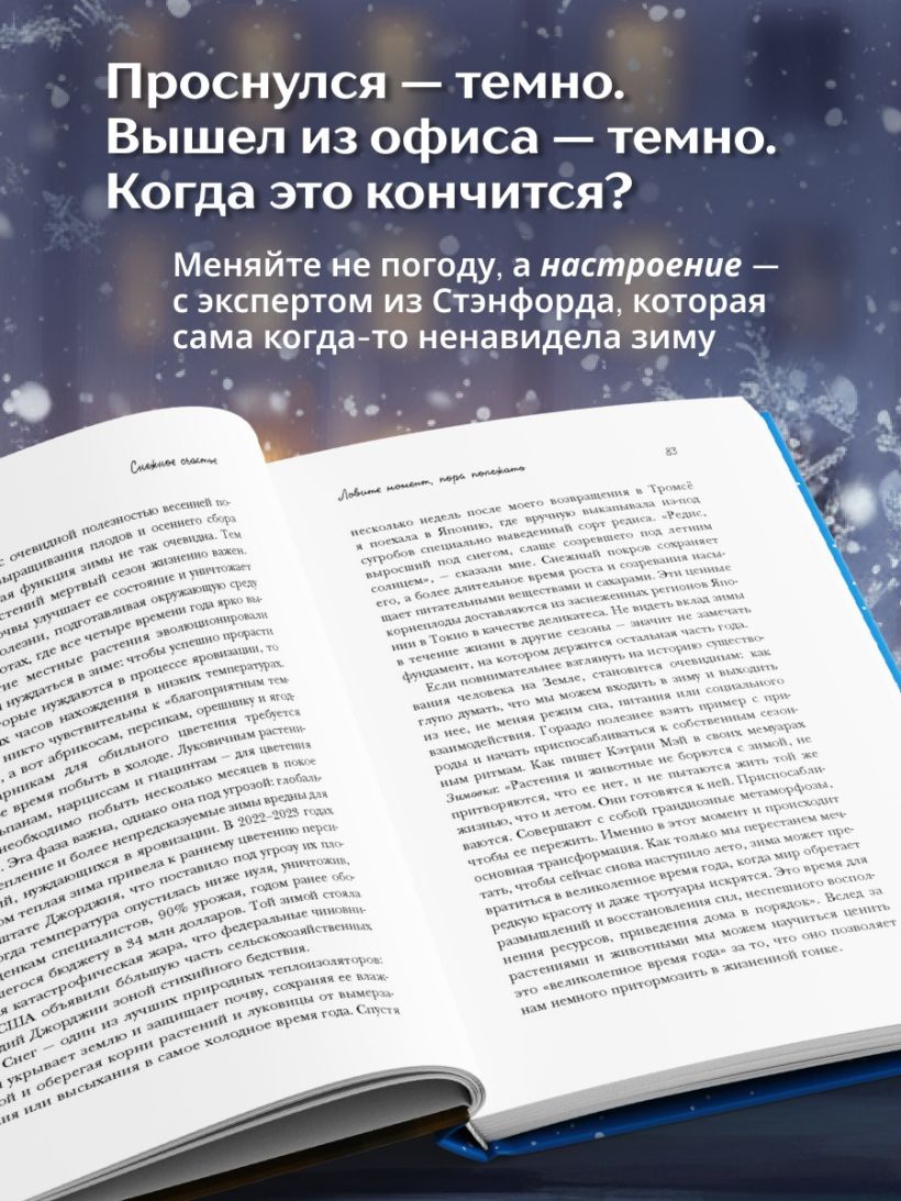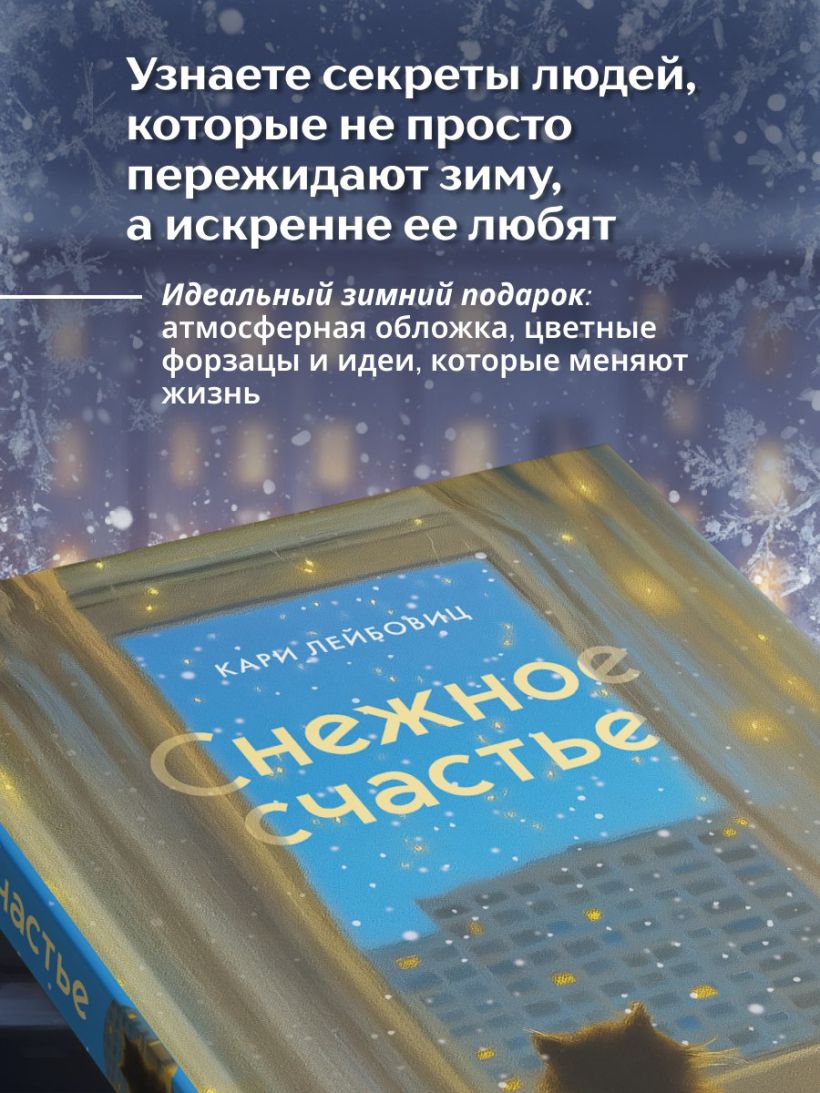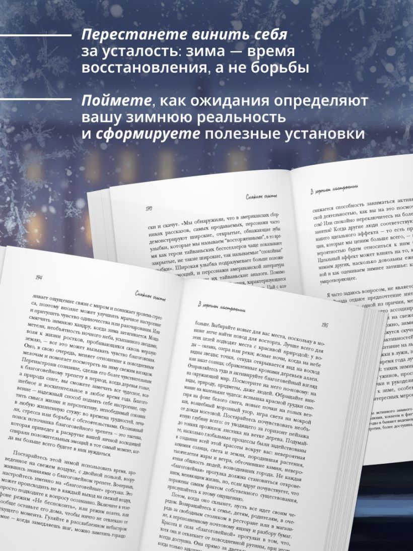 «Снежное счастье» — не просто книга о том, как полюбить зиму. Это обширное исследование психологии мышления и менталитета. Внутри вы найдете стратегии и практические рекомендации, которые помогут сменить внутреннюю оптику, чтобы научиться находить смысл, радость и устойчивость даже в периоды холода и тьмы — как во внешнем мире, так и внутри себя.