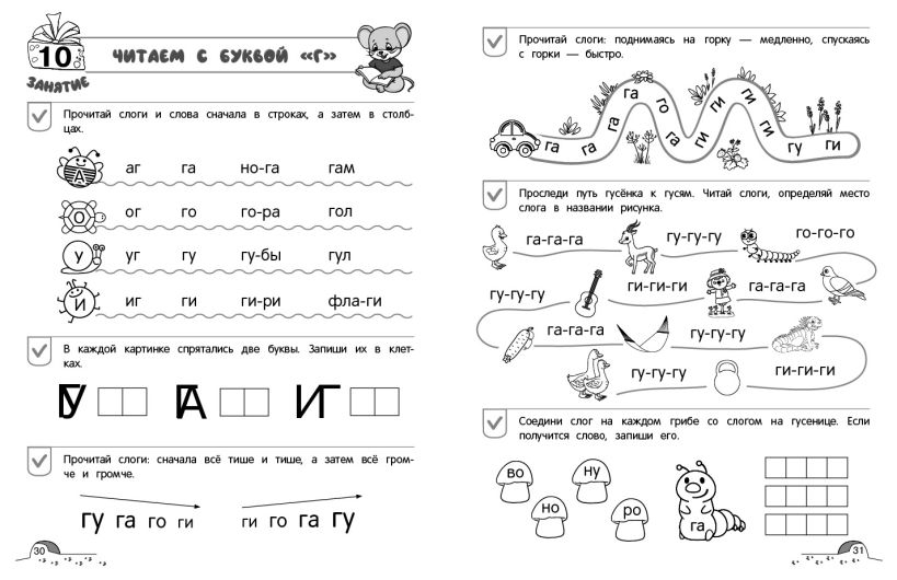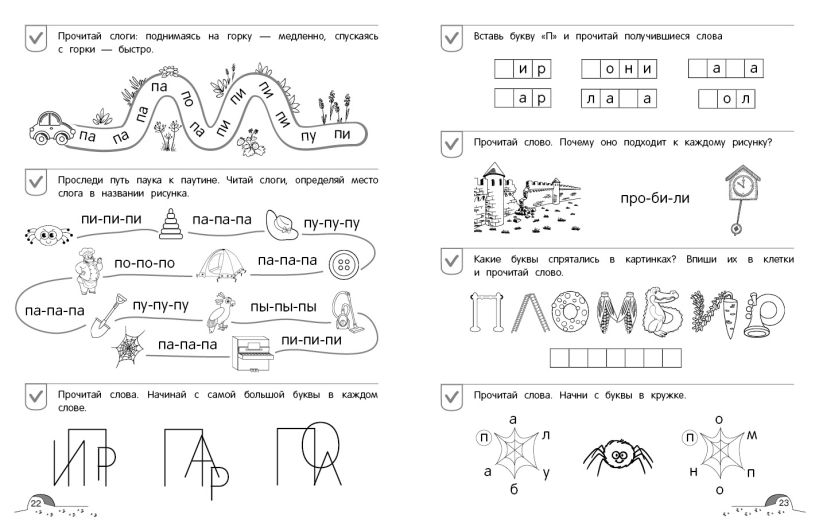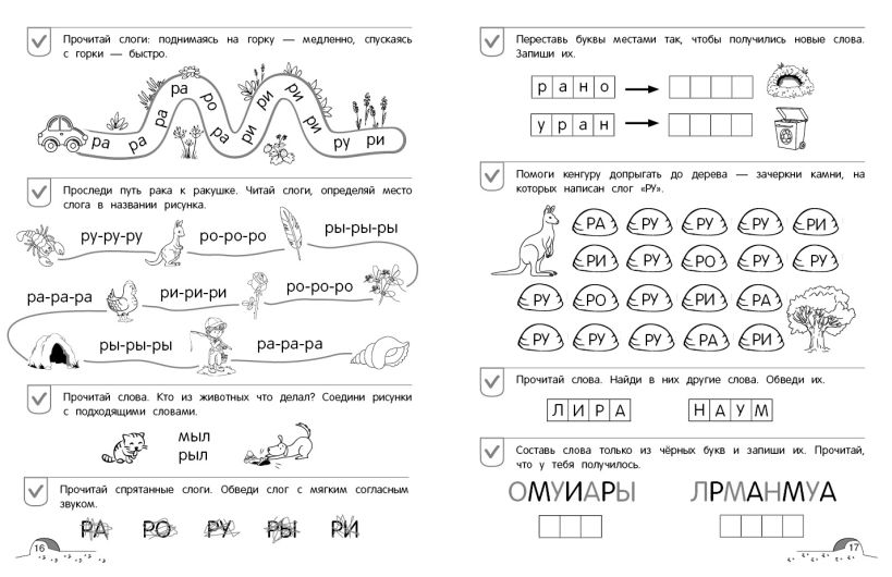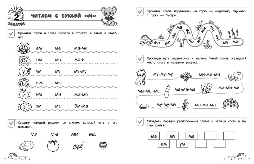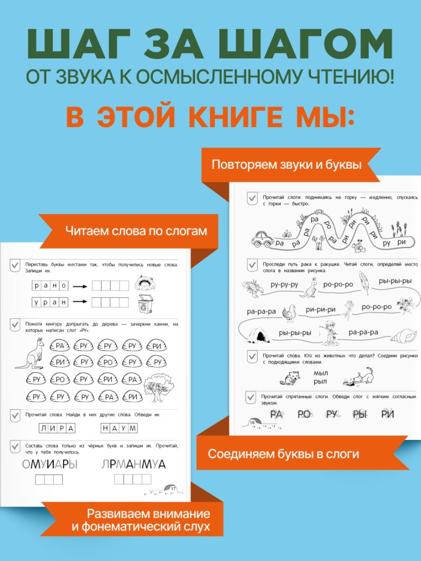 Выполняя упражнения, дошкольник повторит звуки и буквы, потренируется соединять буквы в слоги, читать слова по слогам и делить их на слоги, обогатит словарный запас, разовьёт фонематический слух, связную речь, внимание, графические навыки, сможет подготовить руку к письму, расширить словарный запас, станет более внимательным, усидчивым, уверенным в себе и, что самое главное — положительно настроенным к обучению.