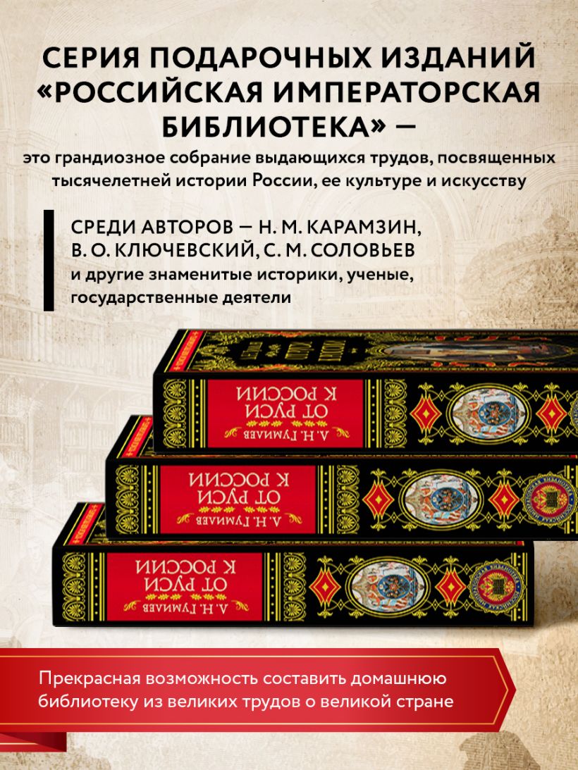 Серия «Российская императорская библиотека» — это грандиозное собрание выдающихся образцов отечественной мысли и словесности. Издания, вошедшие в серию, представляют собой лучшее в великом духовном наследии нашей страны. Это труды, созданные знаменитыми историками, учеными, великими государственными деятелями и посвященные тысячелетней истории России, ее культуре и искусству, военной славе, многовековым народным обычаям и деяниям выдающихся представителей нашего Отечества. Прекрасная возможность составить свою домашнюю библиотеку из великих трудов о великой стране.