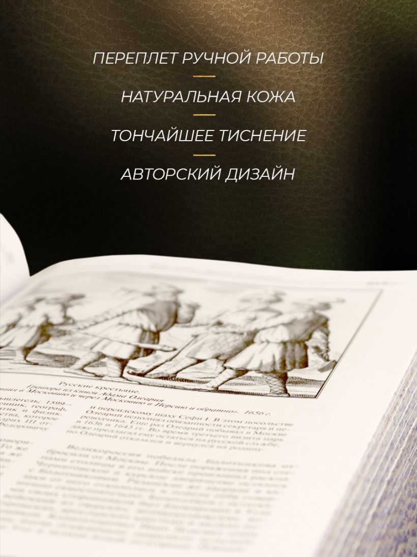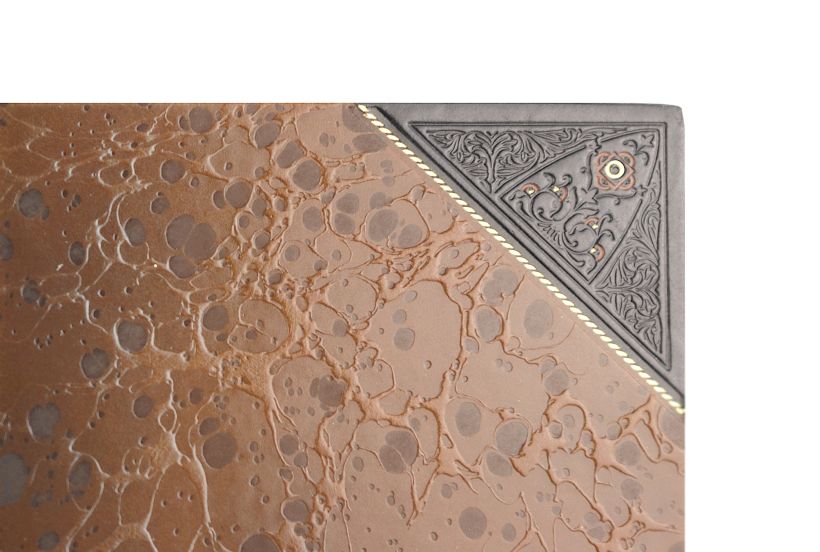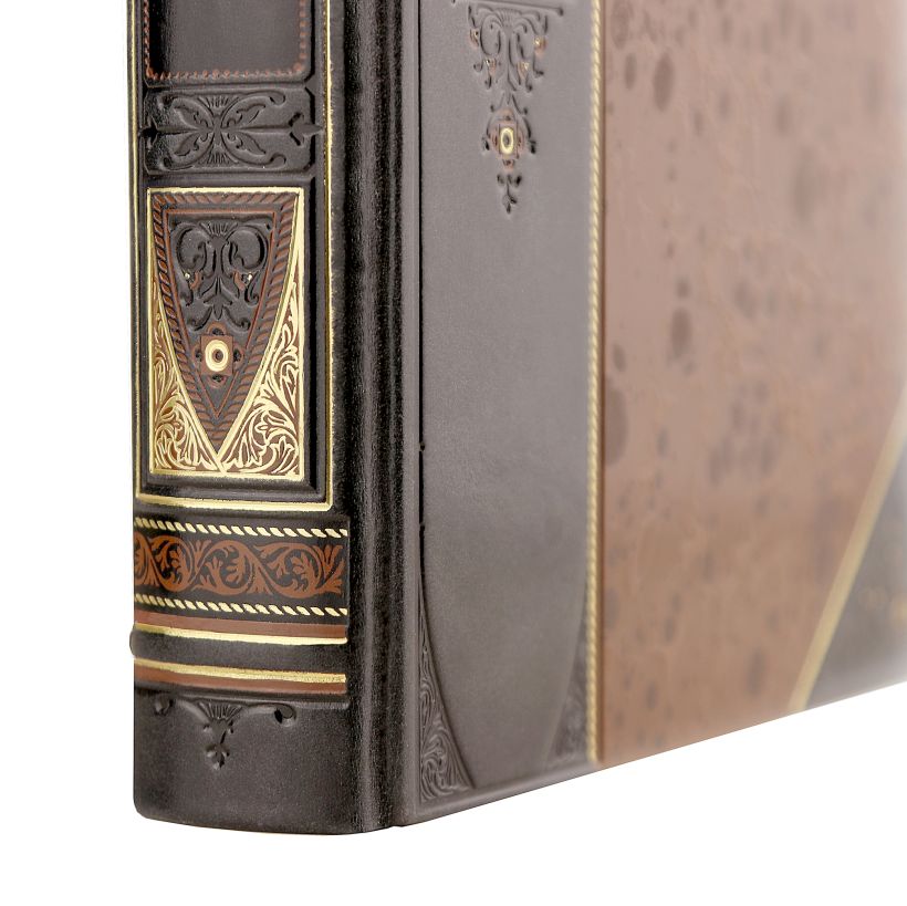 Переплет изготовлен из двух видов натуральной кожи с многоуровневым рельефным рисунком,