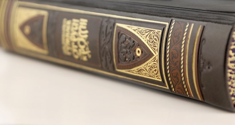 Книга переплетена в строгом следовании технологии XIX века и украшена сплошным тончайшим тиснением, в полном соответствии с лучшими образцами переплетов европейских мастеров.