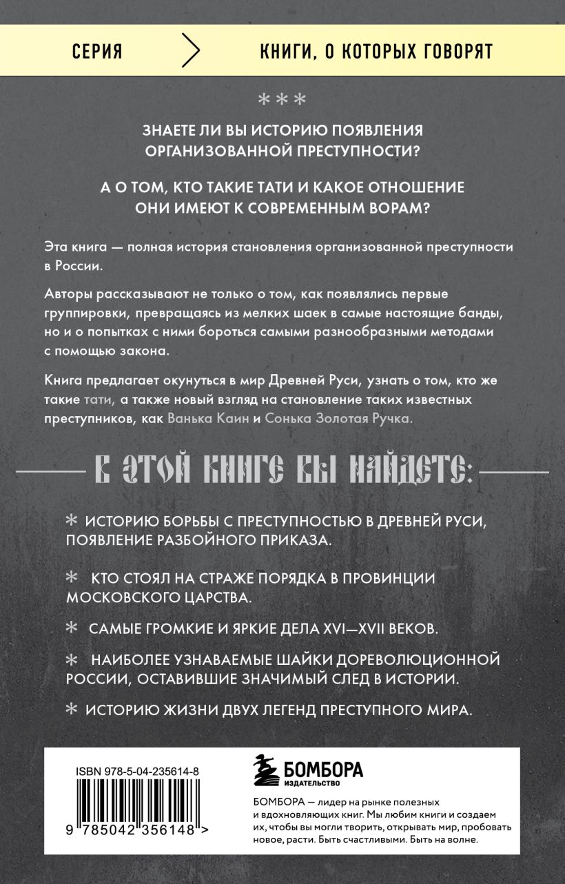 Эта книга — полная история становления организованной преступности в России. Авторы рассказывают не только о том, как появлялись первые группировки, превращаясь из мелких шаек в самые настоящие банды, но и о попытках с ними бороться самыми разнообразными методами с помощью закона. Книга предлагает окунуться в мир Древней Руси, узнать о том, кто же такие тати, а также новый взгляд на становление таких известных преступников, как Ванька Каин и Сонька Золотая Ручка.