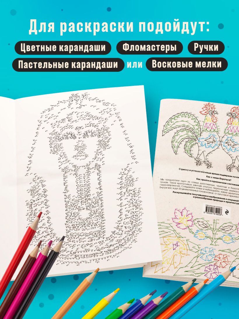 Серия «Арт-терапия» — это множество причудливых узоров и фантастических рисунков, которые подарят вам спокойствие и умиротворение и помогут избавиться от стресса. Возьмите карандаш или ручку и полностью отключитесь от внешнего мира, проводя тонкую линию от точки к точке, и через некоторое время вы вернетесь уже полностью обновленным человеком. Когда закончите — можете раскрасить рисунок.