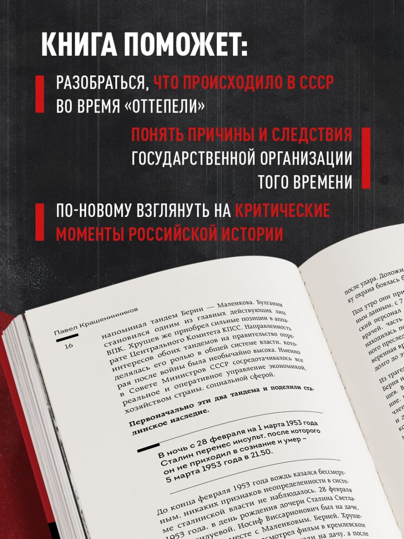 Вслед за более ранними исследователями мы этот период называем оттепелью, в книге делим его на четыре важных отрезка времени. Первый – смерть Сталина, коллективное руководство и борьба за власть (1953–1954 гг.). Второй – захват власти и концентрация ее у Хрущева (1954–1956 гг.). Третий – так называемое разоблачение культа личности Сталина, отказ от практики массовых репрессий после ХХ съезда КПСС и последующий «вынос тела» из мавзолея на Красной площади (февраль 1956 г. – 31 октября 1961 г.). Четвертый – до смещения Хрущева (конец 1961 г. – 1964 г.).