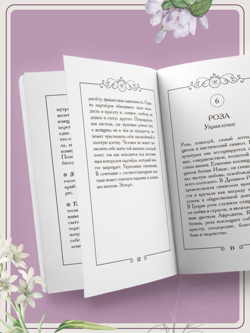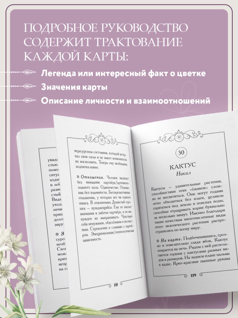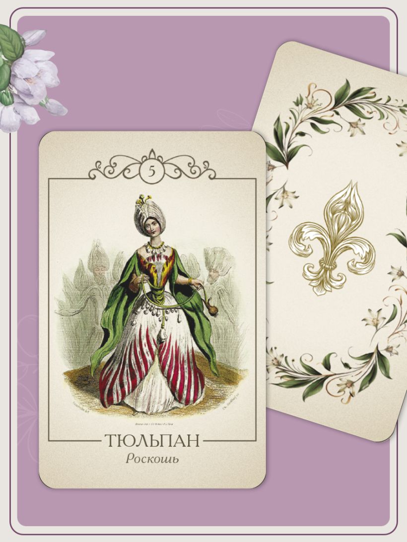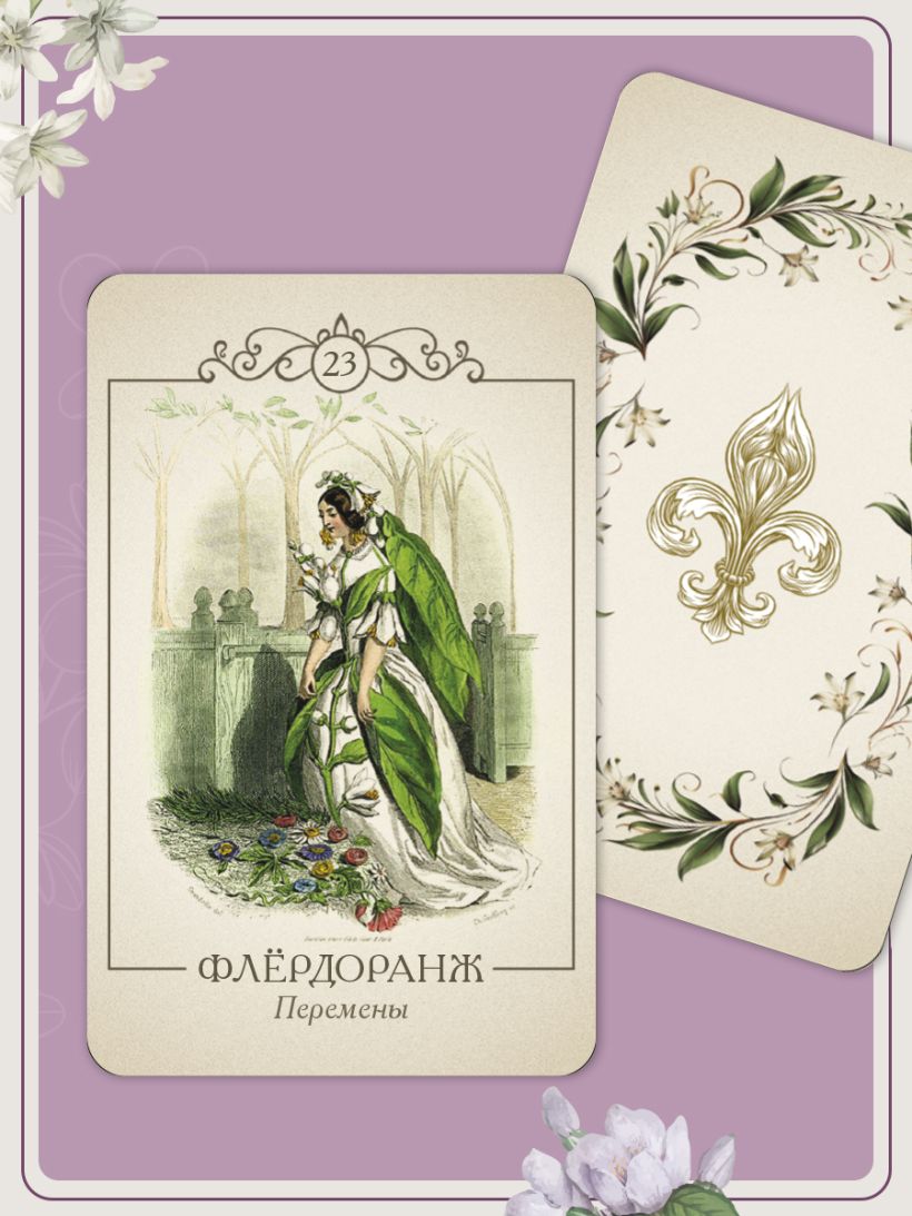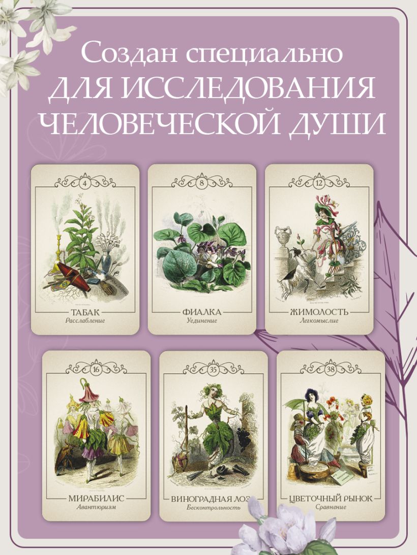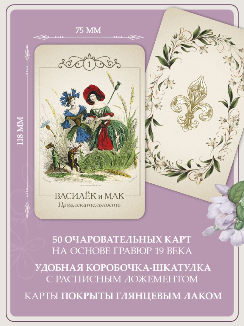 Авторы, опираясь на точные и остроумно переданные Гранвилем характеры цветов, и свою 5-летнюю практику работы с оракулом, создали подробное трактование для каждой карты. Оно включает в себя легенду или интересный факт о цветке, описание карты, основное и теневое значения, описание личности, а также характеристику отношений.