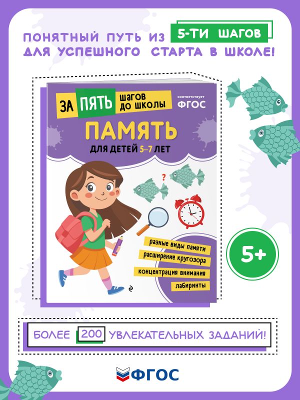 Цель книги, соответствующей ФГОС, — помочь малышу развить разные виды памяти. На каждой странице его ждут увлекательные упражнения, благодаря которым занятия превратятся в интересную игру. Ребенку предстоит запоминать информацию и детали за определенное количество времени, а затем отвечать на вопросы и решать задания по памяти. Выполняя их, дошкольник разовьет память, мелкую моторику, внимание, расширит кругозор и словарный запас. Время, проведённое за занятиями, будет полезным и приятным!