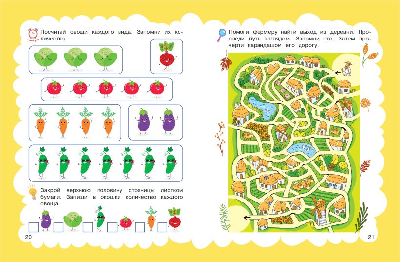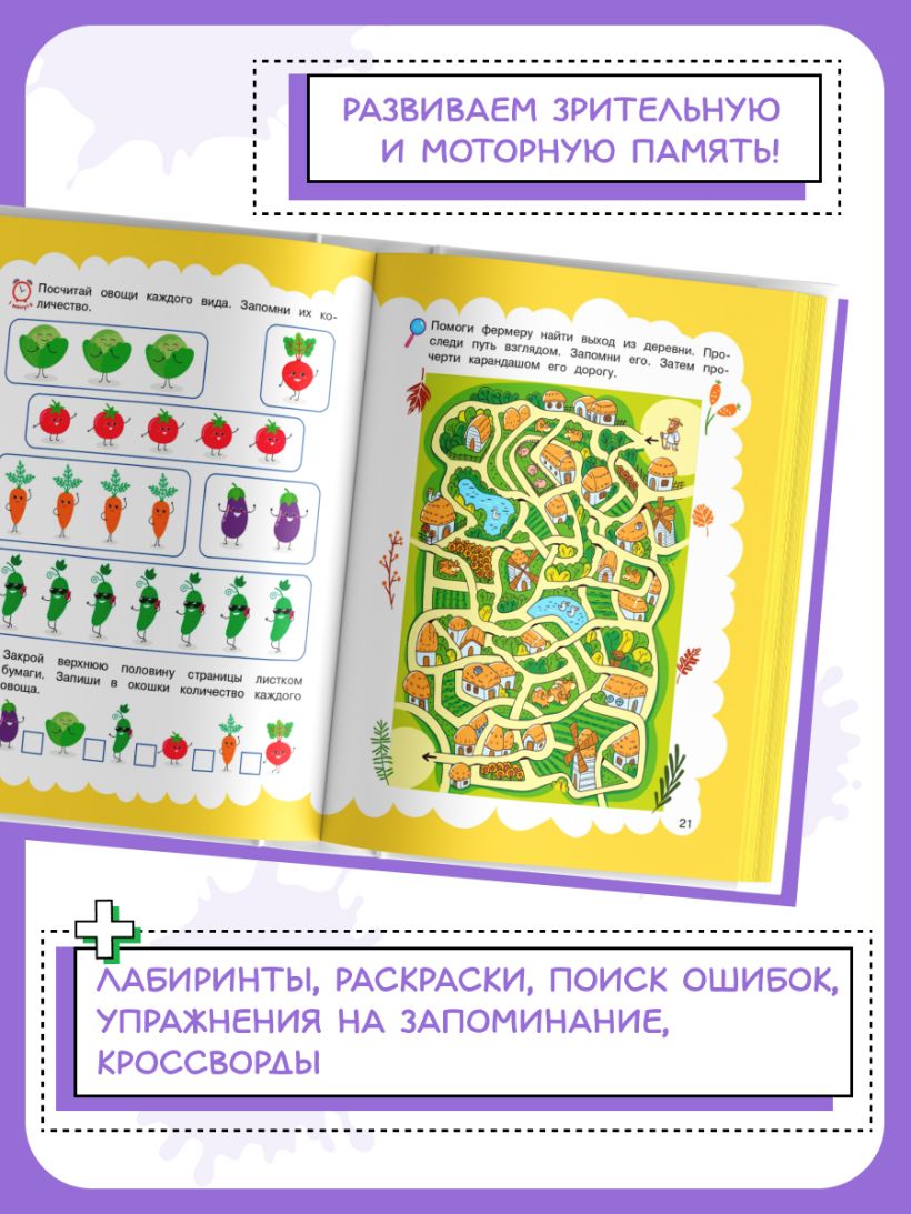 Кроме того, пособие содержит детские развивающие игры, такие как лабиринты, раскраски по образцу, поиск ошибок, упражнения на запоминание, кроссворды. Такие упражнения поспособствуют развитию и тренировке воображения, моторики, логики, внимания и мышления. Занимаясь, ребенок будет активно готовиться к школе. Все, что для этого нужно — цветные карандаши и хорошее настроение!