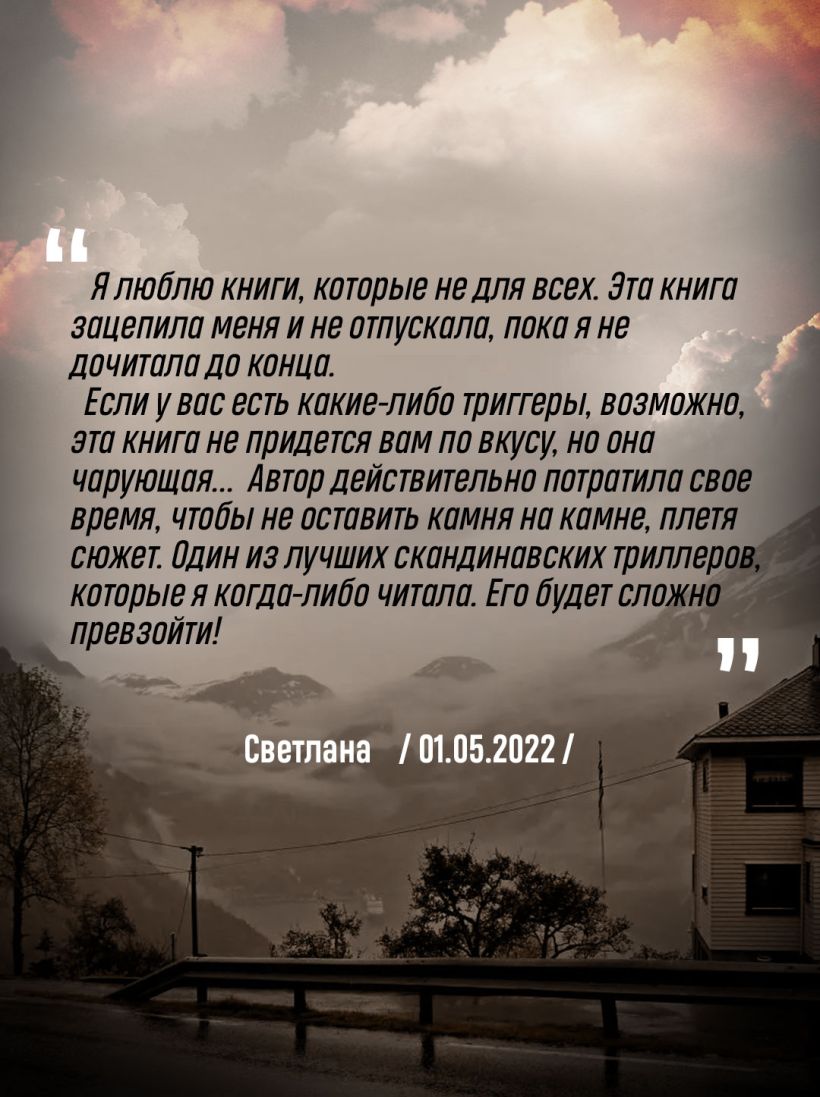 «Высокий прицел, стопроцентное попадание в цель. Благодаря убедительной, более или менее свободной от клише прозой и изысканному чувству композиции Силье Ульстайн удалось написать действительно выдающийся триллер». – Aftenposten