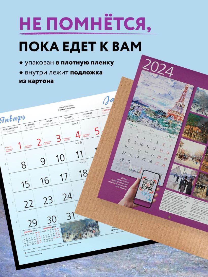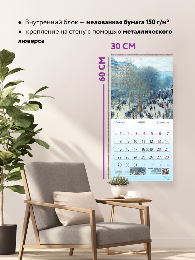 Практичный и эстетичный, этот календарь каждый месяц будет радовать вас. Прекрасные картины органично дополнят любой интерьер и помогут планировать время. В этом календаре представлены шедевры разных творцов, вдохновленных Парижем.