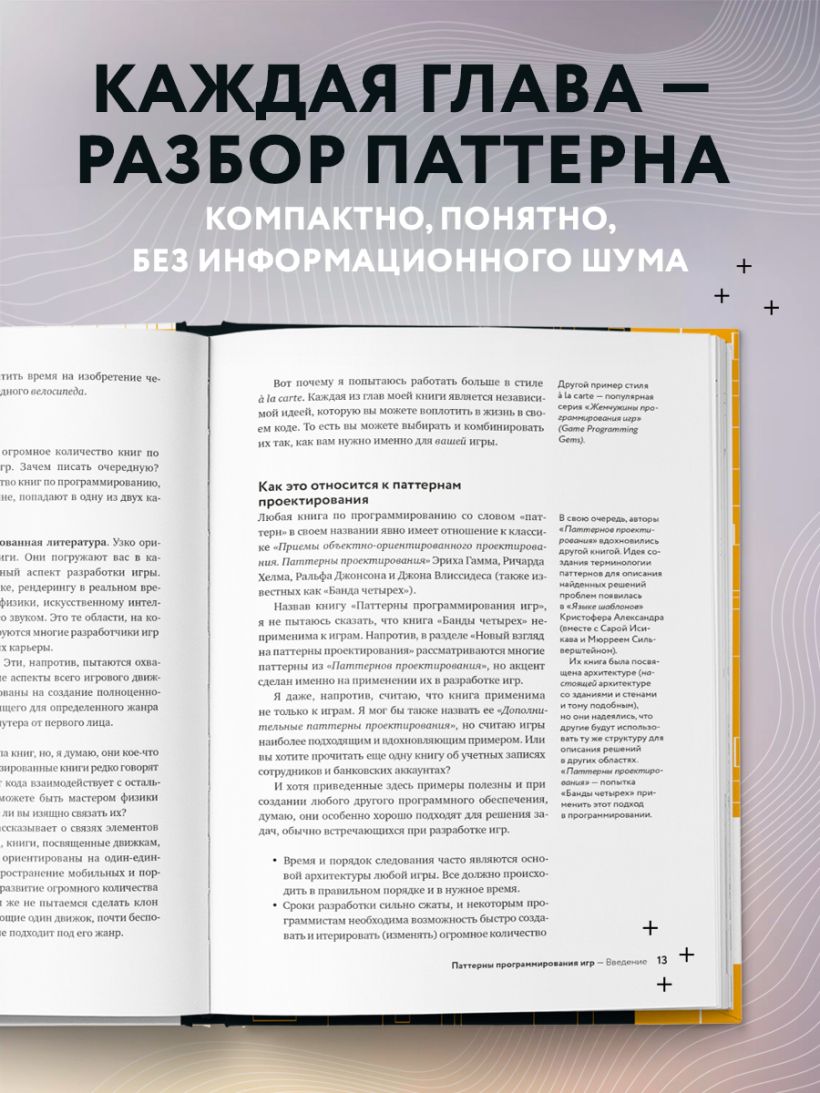 Каждая глава книги — набор эффективных паттернов программирования, которые вы можете использовать в работе в готовом виде или улучшать и комбинировать их на свой лад для вашей собственной игры.