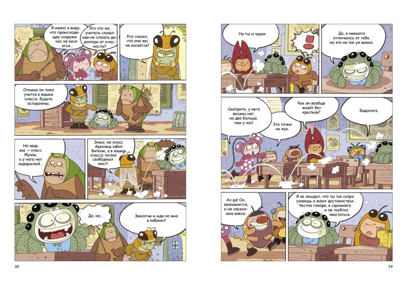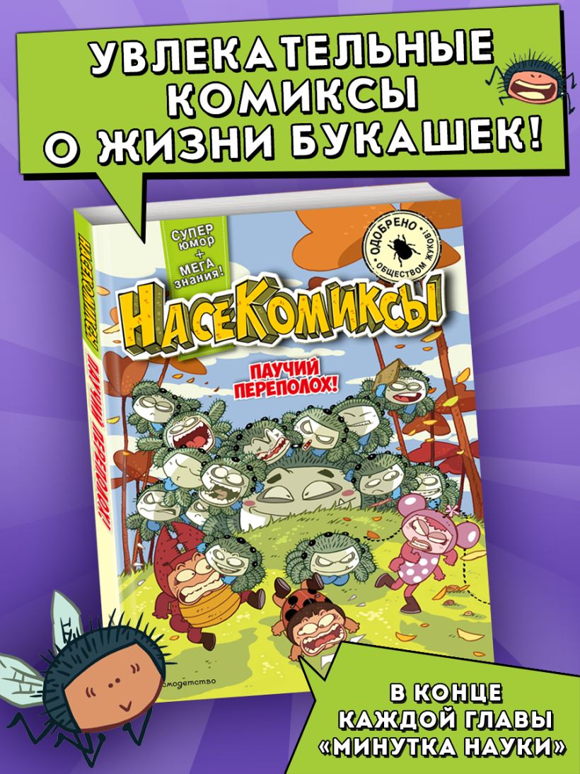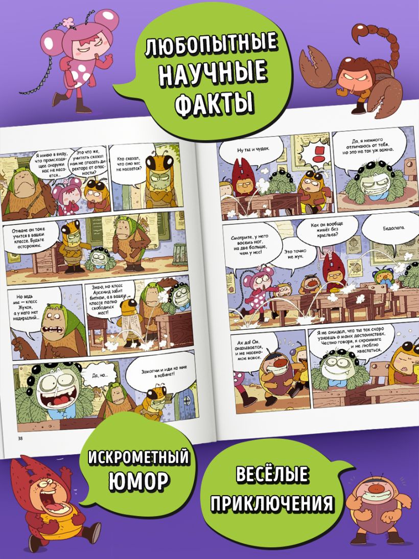 Впервые в России — серия познавательных комиксов про насекомых! Герои комикса — совсем как настоящие дети: ходят в школу, дружат, попадают в переделки, но… все они — НАСЕКОМЫЕ!