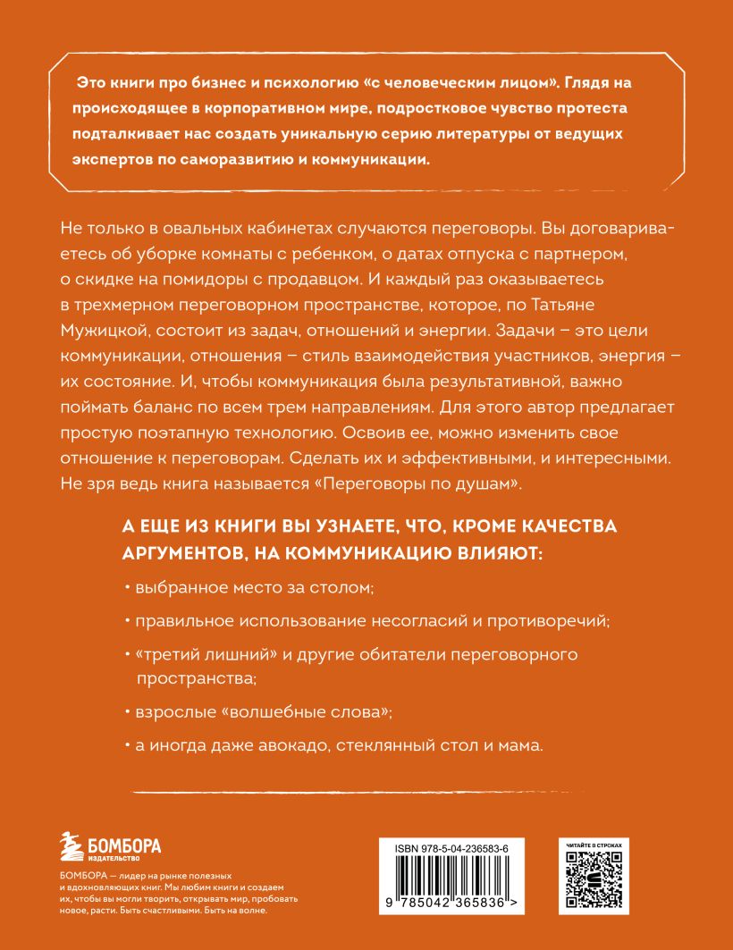 Не только в овальных кабинетах случаются переговоры. Вы договариваетесь об уборке комнаты с ребенком, о датах отпуска с партнером, о скидке на помидоры с продавцом. И каждый раз вы оказываетесь в трехмерном переговорном пространстве, которое, по Татьяне Мужицкой, состоит из задач, отношений и энергии. Задачи — это цели коммуникации, отношения — стиль взаимодействуя участников, энергия — их состояние. И, чтобы коммуникация была результативной, важно поймать баланс по всем трем направлениям. Для этого автор предлагает простую поэтапную технологию. Освоив ее, можно изменить свое отношение к переговорам. Сделать их и эффективными, и интересными. Не зря ведь книга называется «Переговоры по душам».