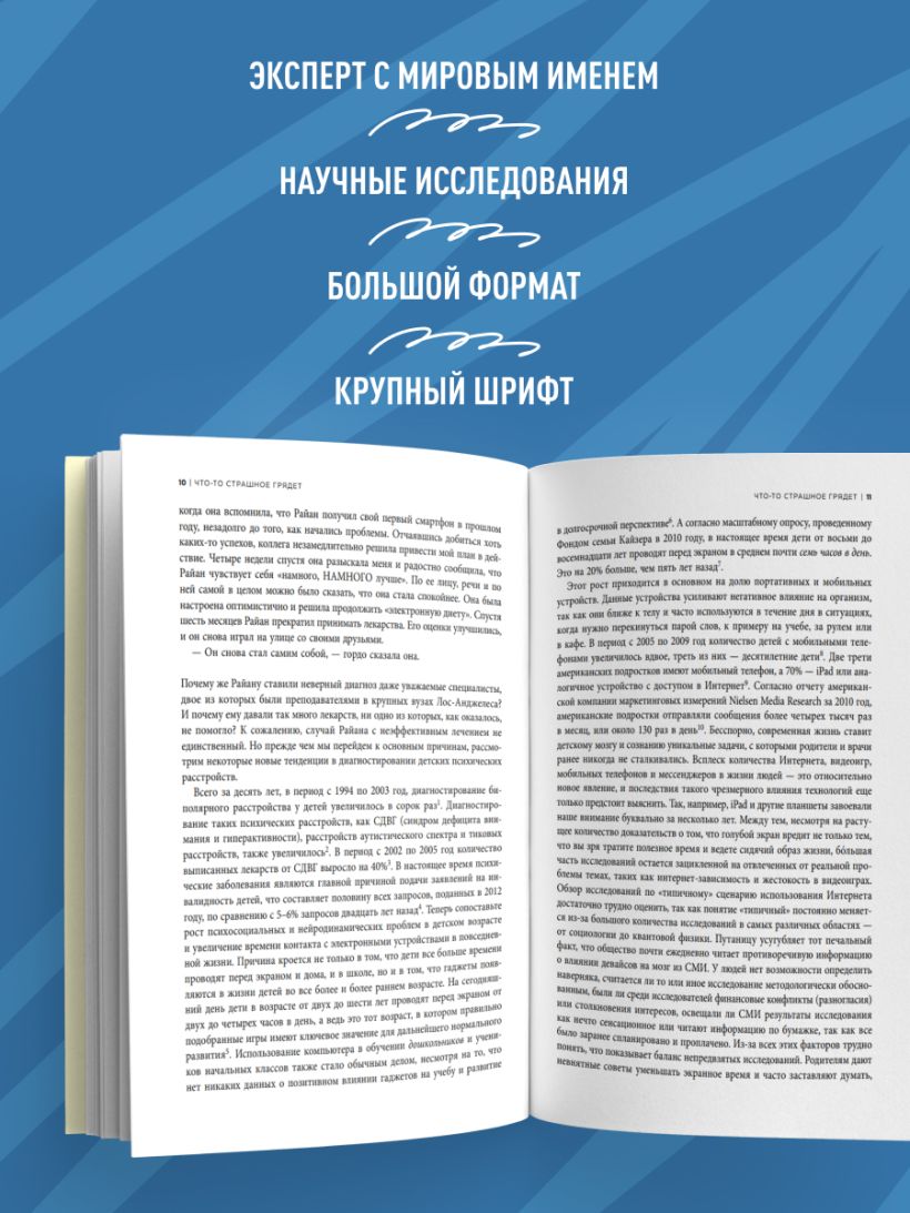 Известный детский психиатр Виктория Л. Данкли связывает эти симптомы с чрезмерным увлечением детей гаджетами. Она разработала простую 4-хнедельную программу, которая поможет ребенку вернуть концентрацию, внимательность, интерес к учебе и общению со сверстниками. Автор подробно разбирает, как электронные девайсы влияют на мозг, и при этом понимает, что сегодня невозможно отказаться от цифрового мира. Виктория Л. Данкли помогает найти баланс и эффективно оградить ребенка от пагубного влияния гаджетов. Эта программа помогла пациентам избавиться от СДВГ и эмоциональных расстройств, а главное, снова стать жизнерадостными и любопытными детьми.