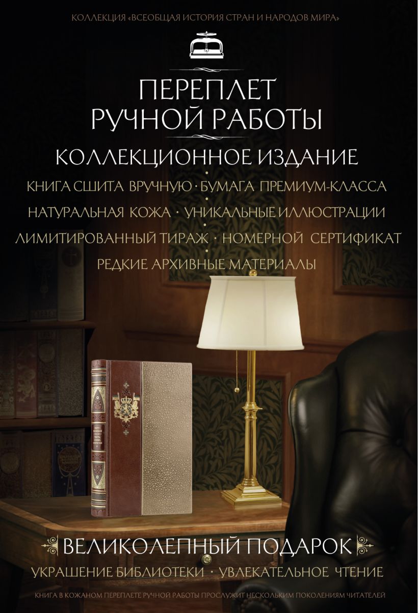 Коллекционное иллюстрированное издание в изящном составном кожаном переплёте ручной работы с торшонированным обрезом. Тираж 2022 года - 2 нумерованных экземпляра. Книги отпечатаны на бумаге премиум-класса и сшиты вручную на льняные нити. Переплеты созданы по традиционной для 19 века технологии из гладкой натуральной кожи двух цветов и украшены тремя видами тончайшего тиснения – золотым, рельефным и красочным. Украшает книгу изысканный тиснёный орнамент, обрамляющий символ серии – корона на пурпурном поле щита, поддерживаемого двумя львами, символами власти, великолепного качества рельефное тиснение дает особые тактильные ощущения. Форзацы книги сделаны из дизайнерской хлопковой бумаги. Каптал и ляссе из золотистого шёлка. В книгу помещен сертификат, отпечатанный на эко-бумаге, пронумерованный вручную. Великолепный подарок ценителям хорошей книги и мировой истории. Все книги серии оформлены в едином стиле и будут великолепно смотреться на книжной полке.