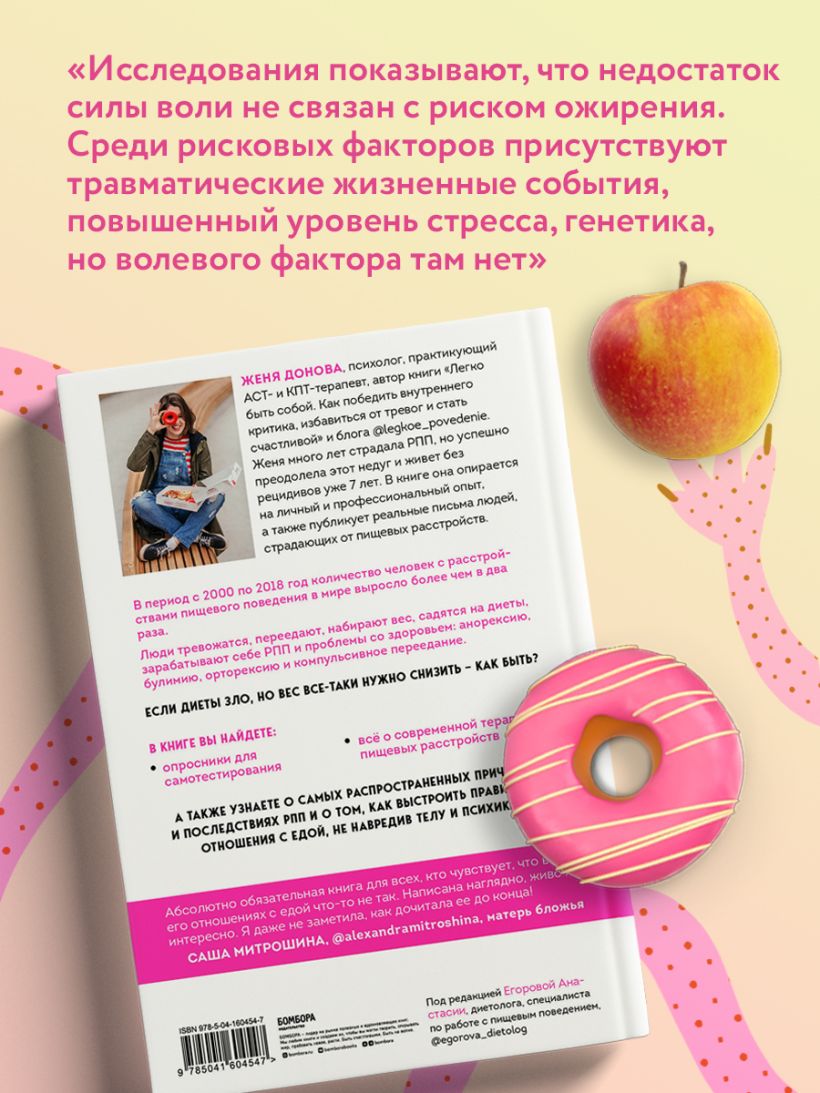 В век пищевого изобилия, когда нам доступны любые продукты, а найти информацию о правильном питании не составляет труда, люди все равно продолжают страдать от различных пищевых расстройств. Из новой книги практикующего психолога Жени Доновой вы узнаете, откуда берется недовольство собственным телом, какие самые распространенные причины и последствия РПП, что считается нормой, а что тревожным звоночком, какая терапия пищевых расстройств применима сегодня. Вы поймете, как выстроить правильные отношения с едой, не навредив телу и психике.