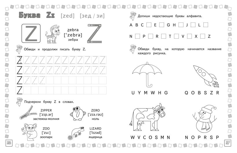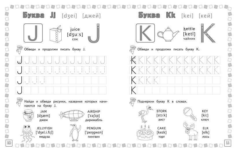 Задача прописей для дошкольников — не только научить ребенка писать буквы, но и помочь ему выучить английский алфавит, познакомить с первыми иностранными словами и их произношением. Выполняя увлекательные игровые задания, ребенок будет обводить буквы по пунктиру, вписывать их в слова, составлять из букв новые слова. Написание букв способствует не только их быстрому запоминанию, но и вырабатывает у дошкольника навык чистописания и орфографическую зоркость, которые являются важнейшим условием грамотного письма. Забавные позитивные картинки доставят детям удовольствие и будут способствовать получению высокого результата. Кроме того, пропись поможет развить у ребенка мелкую моторику, графические навыки, усидчивость, внимание и терпение – навыки, которые очень важны для обучения в школе.