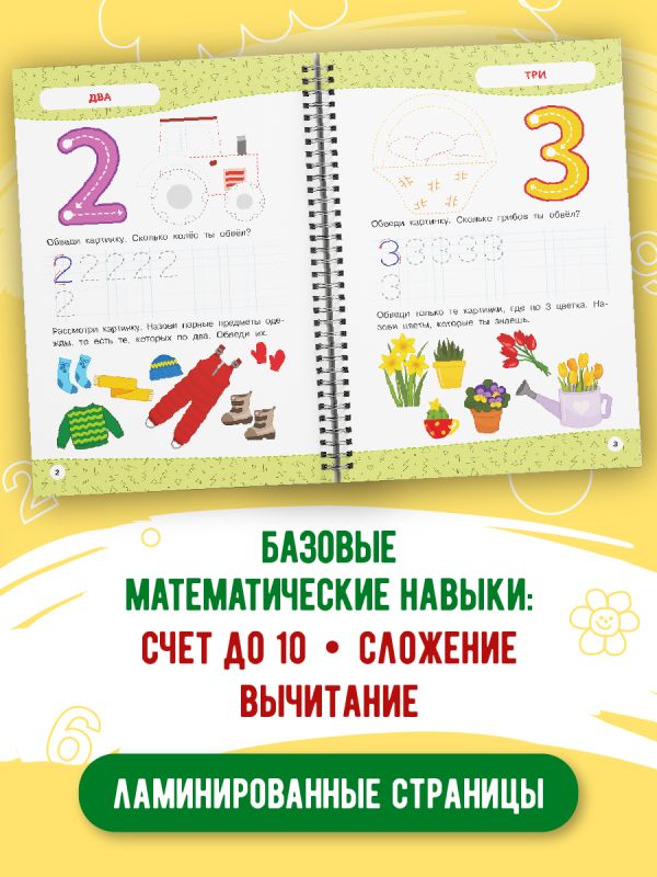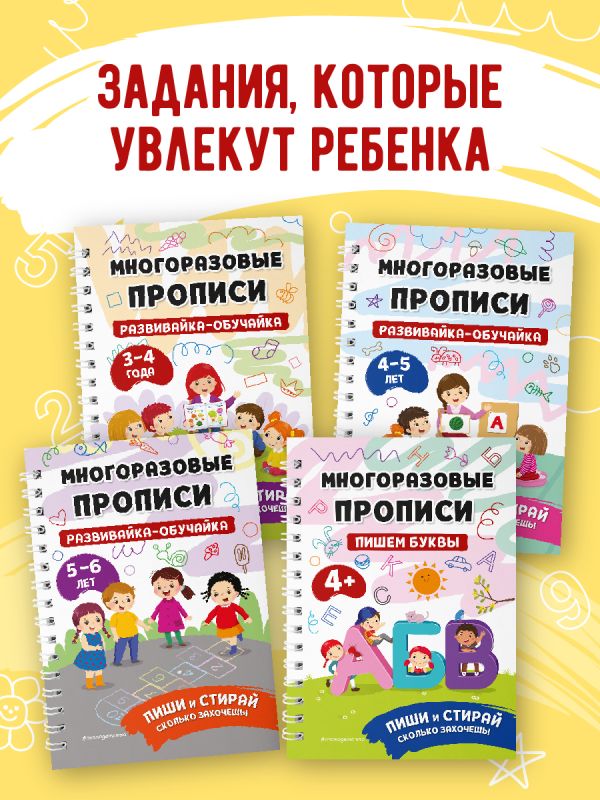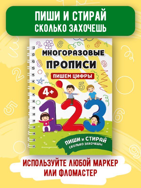 Многоразовые прописи для детей 4—7 лет — уникальное пособие, которого хватит надолго! Дошкольник сможет писать и рисовать в тетради маркером или фломастером сколько угодно раз, а потом сам стирать написанное салфеткой. Выполняя увлекательные игровые задания, дошкольник научится писать цифры, освоит порядковый счёт, действия сложения и вычитания в пределах первого десятка, разовьёт внимание, логическое мышление, координацию движений, подготовит руку к письму, станет аккуратным и самостоятельным. Размер пособия — немного больше ученической тетради и, по мнению психологов, идеален для детских занятий. Прописи не боятся воды и устойчивы к механическим воздействиям. Их удобно брать с собой в дорогу и на дачу. Пособие станет любимой игрушкой вашего ребёнка, он не захочет выпускать его из рук. Многоразовые прописи — лучшие развивашки для детей от 3 лет, которые подойдут для девочек и мальчиков. Это замечательный подарок, сочетающий развивающие игрушки и полезные занятия, которые увлекут вашего ребёнка.