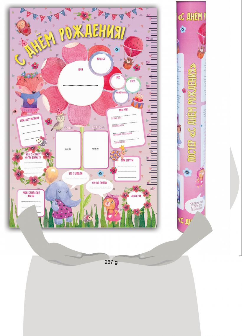 О плакате Новинка! Красочный плакат «С днем рождения» для детей от 1 года до 12 лет. Украсит самый яркий праздник в году, организует минуты веселого заполнения, рисования и украшения, запомнит все важные факты о ребенке (рост, вес, размер ноги, достижения, мечты, крылатые фразы, любимые вещи и др., а также места под фото 10х15 см). Бонус Ростомер от 80 до 150 см. Оформление Размер 60х90 см, плотная мелованная бумага, упаковка - тубус. Польза - украшение праздника, - веселое времяпрепровождение, - память на долгие годы, - полезная традиция. Универсальность Плакат можно повесить где угодно: дома или на улице. А плотная упаковка не даст ему помяться или испортиться.