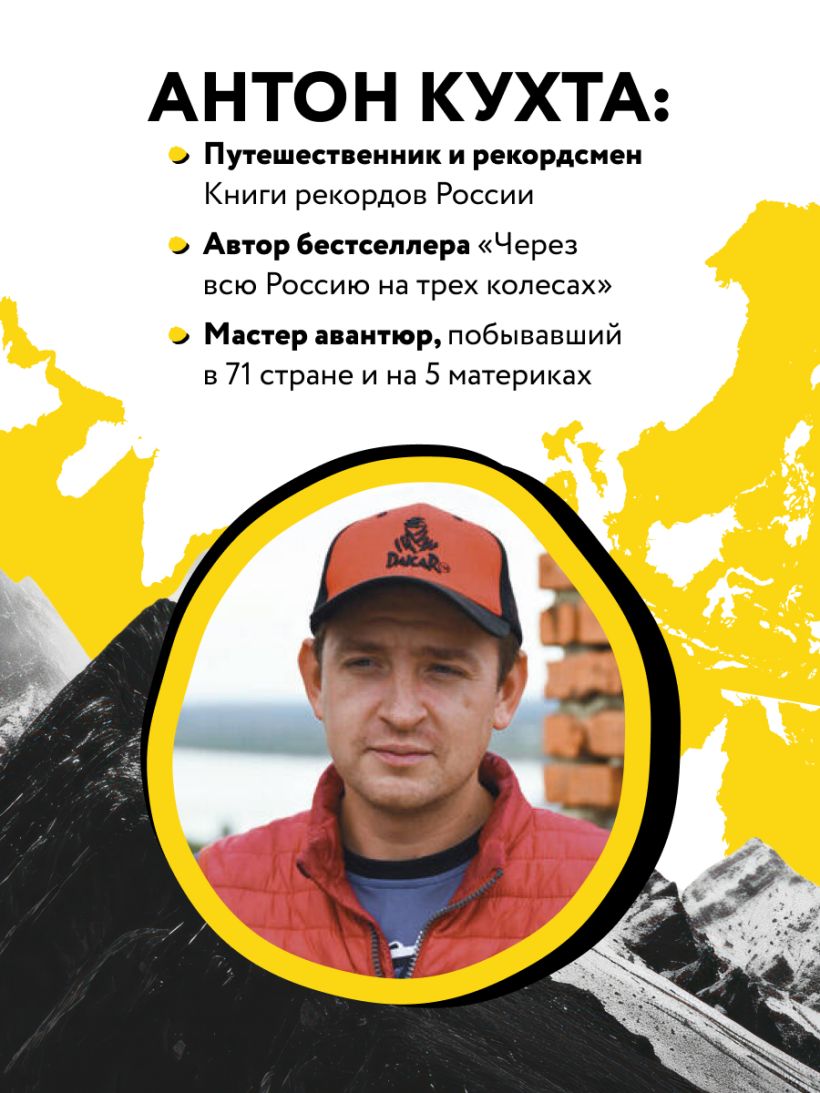 Антон Кухта — путешественник, блогер, член Русского географического общества, автор культового тревел-блога «Посетить все страны мира по цене однушки». За плечами — 71 страна, 5 материков, включая Антарктиду, и тысячи километров самых необычных маршрутов: от джунглей Эквадора до северных скал Каракорума.