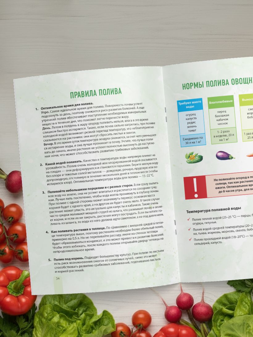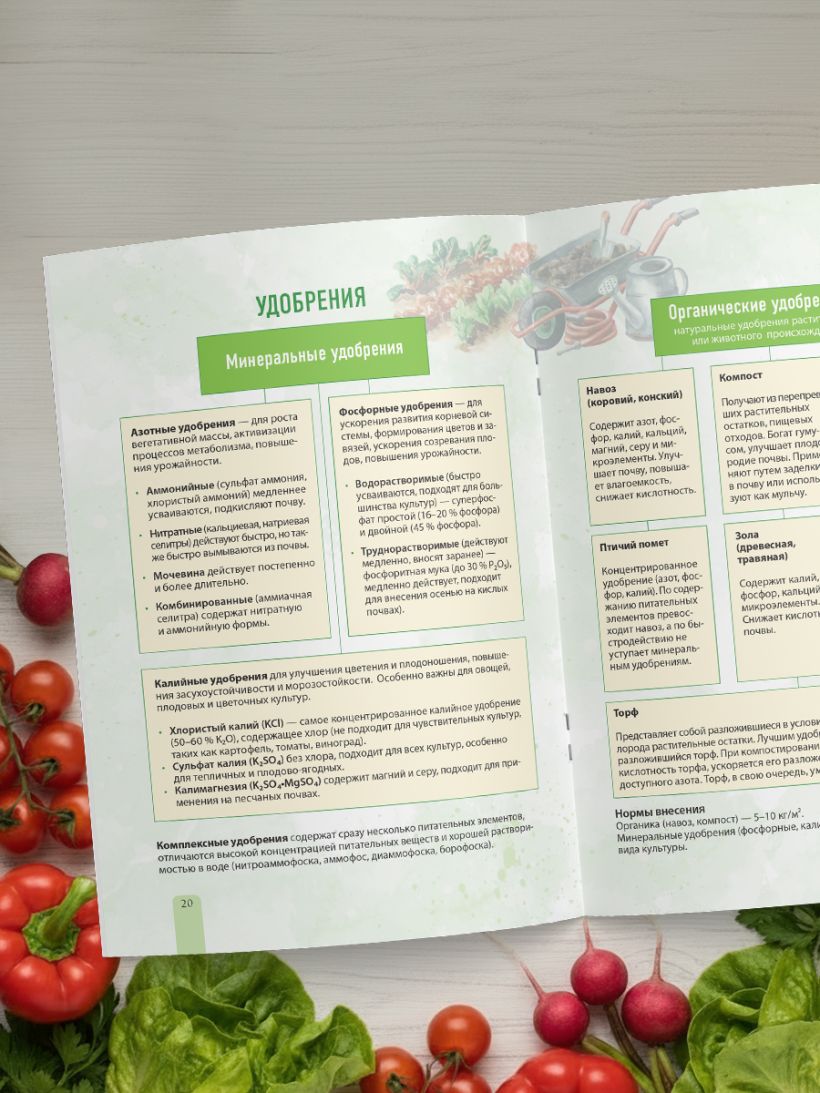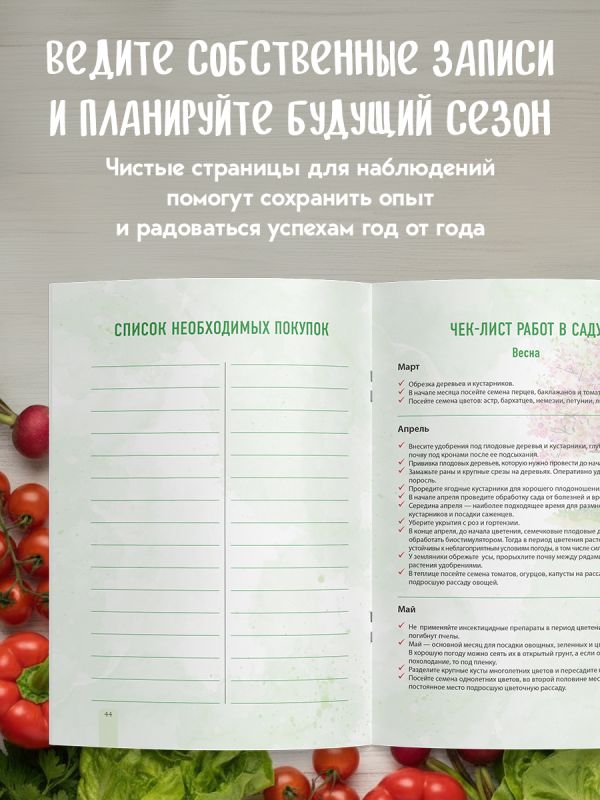 Внутри собраны все важные знания в виде шпаргалок для работ в саду и на огороде: