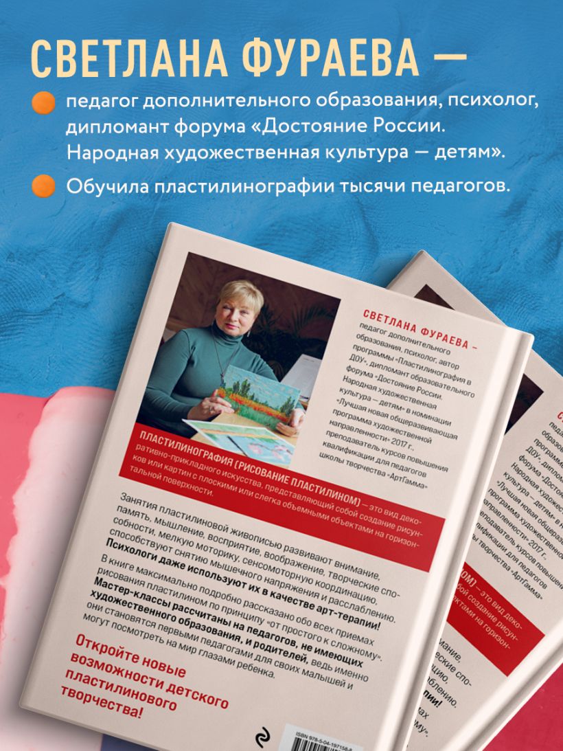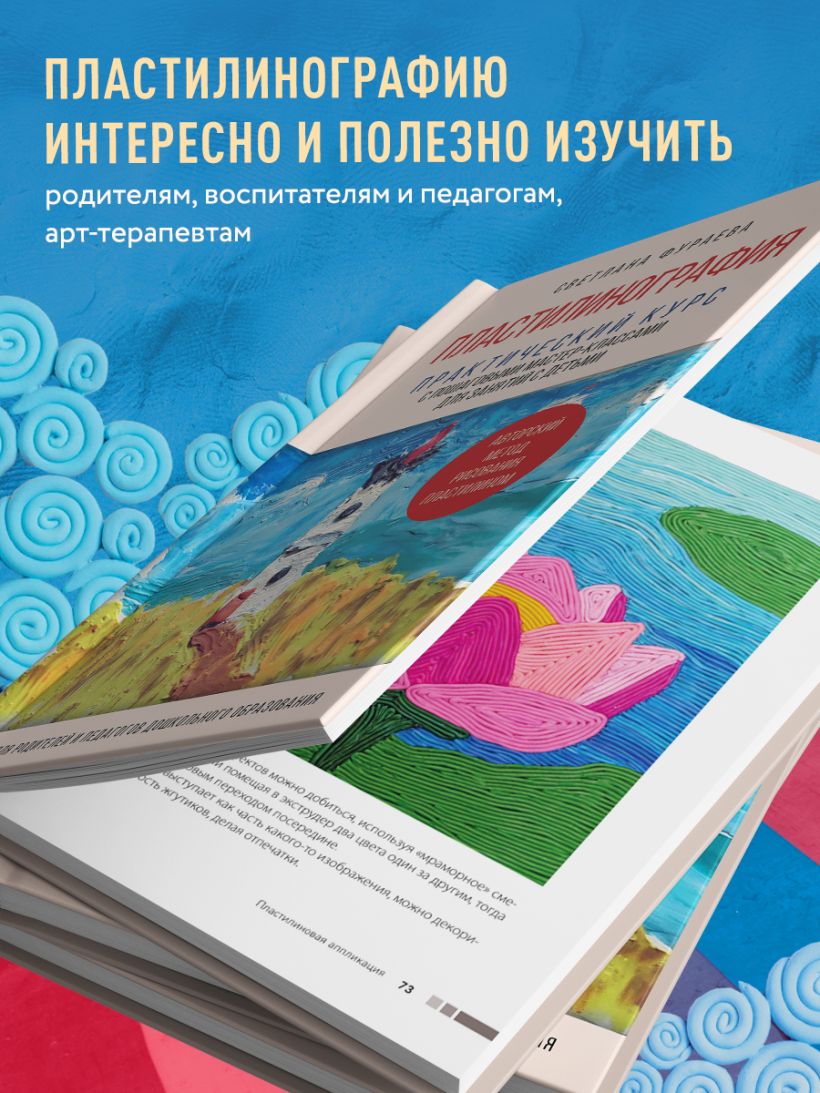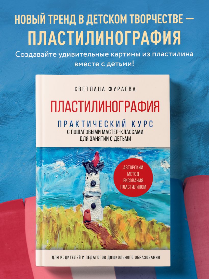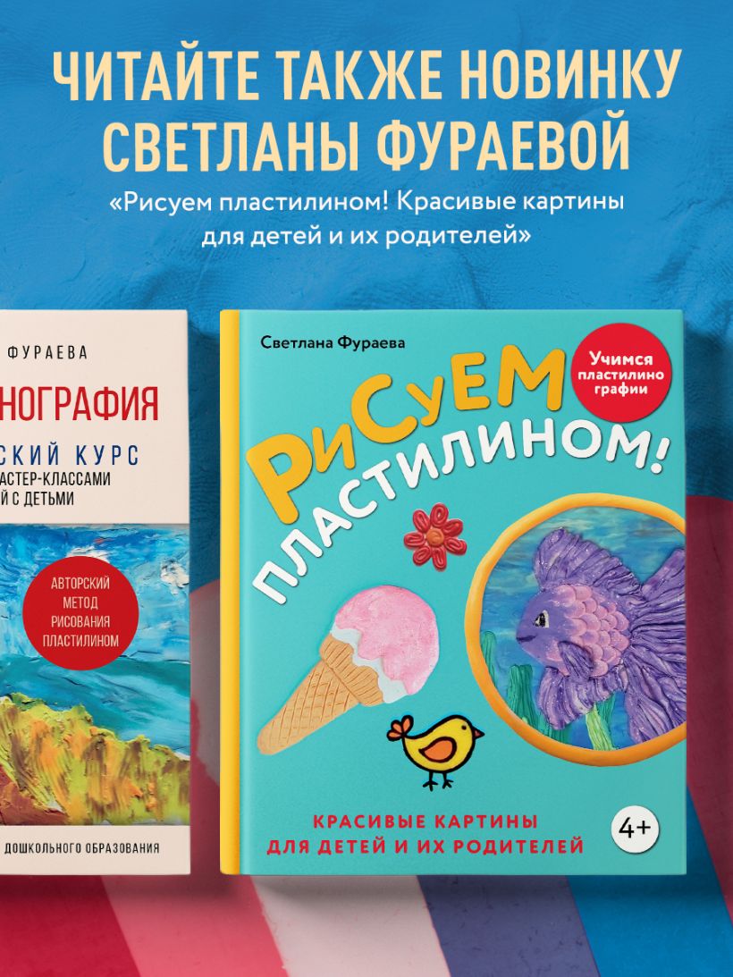 Учимся пластилинографии — рисуем пластилином! Вместе со Светланой Фураевой — педагогом и психологом, дающим бесценные авторские советы. 11 авторских мастер-классов — для развития мелкой моторики ребенка, координации движений, памяти, воображения и даже силы воли. В книге: • 11 красивых картин, которые создаст ребенок под вашим руководством или самостоятельно. • Пошаговые инструкции в ярких картинках по рисованию пластилином. • Авторские подсказки, удобные QR-коды со ссылками на эскизы и видеоролики — можно не только читать, но и смотреть! • Пластилиновые картины для малышей: мамин букет, мороженое и живые цифры. • Мастер-классы для детей постарше: кувшинки Клода Моне и даже пластилиновый мультфильм. Великолепные работы, и полный восторг от процесса и результата! Все это и есть — пластилинография!