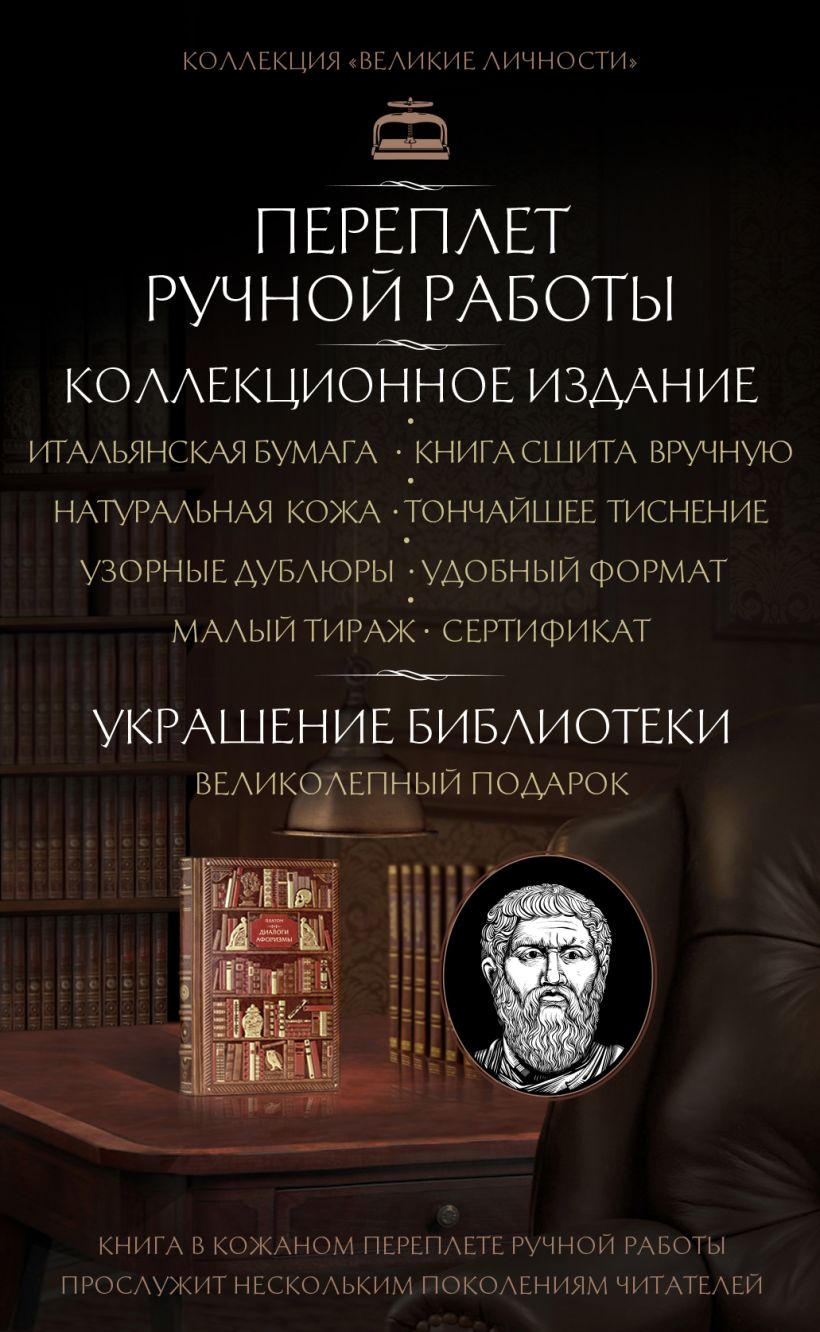 Коллекционное издание в серии «Великие личности», включающей в себя 21 том знаменитых сочинений крупнейших философов, ученых, писателей и военачальников прошлых веков и нового времени в популярном изложении. Издание в переплёте ручной работы отпечатано на бумаге премиум-класса цвета чайной розы и сшито вручную. Заявленный тираж 2020 года - 15 нумерованных экземпляров. В каждом экземпляре - избранные цитаты и гравированный портрет автора, отпечатанные на дизайнерской бумаге, изготовленной на четверть из натуральной кожи. Переплеты созданы по традиционной для 19 века технологии из гладкой натуральной кожи и украшены тремя видами рельефного тиснения - золотым. рельефным и красочным. Форзацы книги из дизайнерской тонированной бумаги и тиснёные золотом орнаментальные дублюры. Каптал и ляссе из шелка и трехсторонний торшонированный обрез.