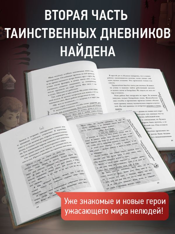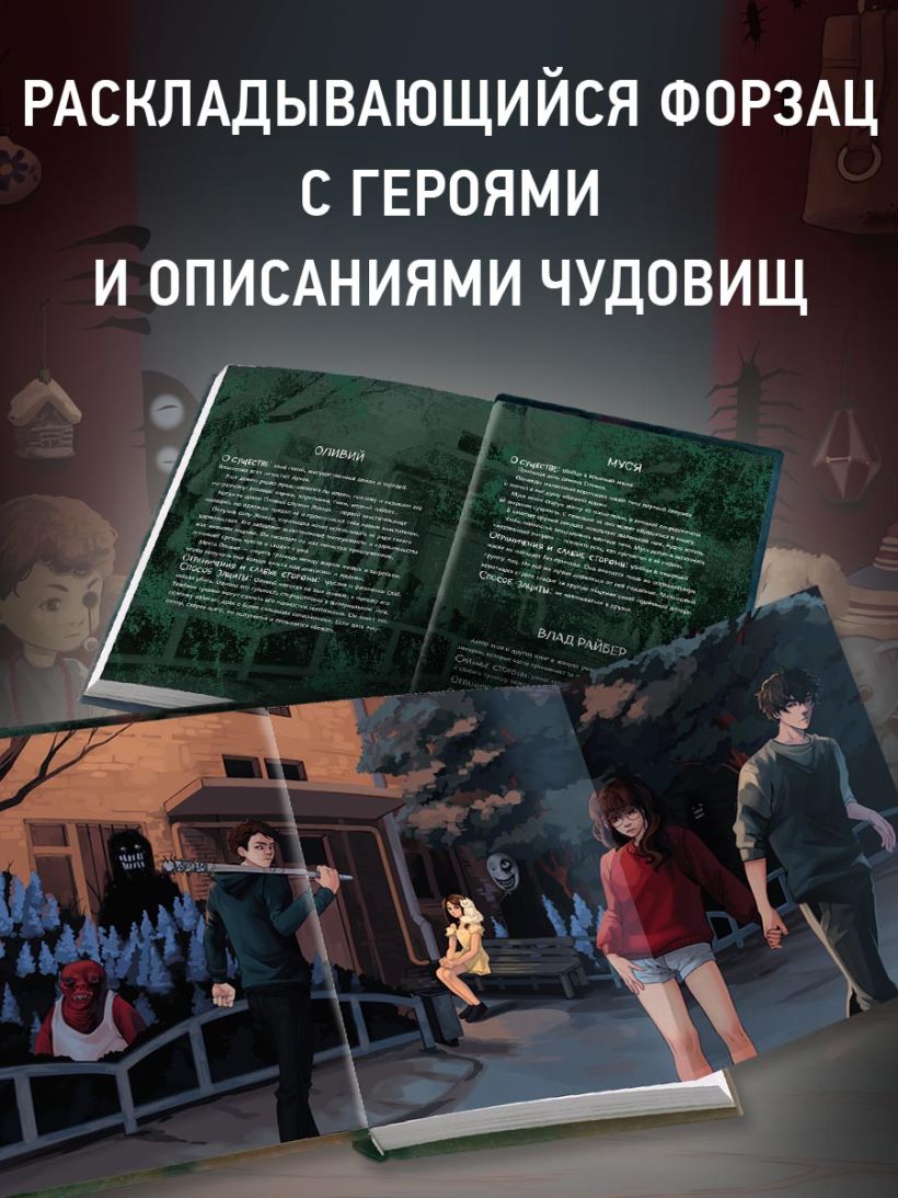 Атмосферное серийное оформление — соберите целую полку страшных историй от автора! Внутри красочные форзацы с изображениями и досье монстров, необычное внутреннее оформление с записками, иллюстрациями и пометками.