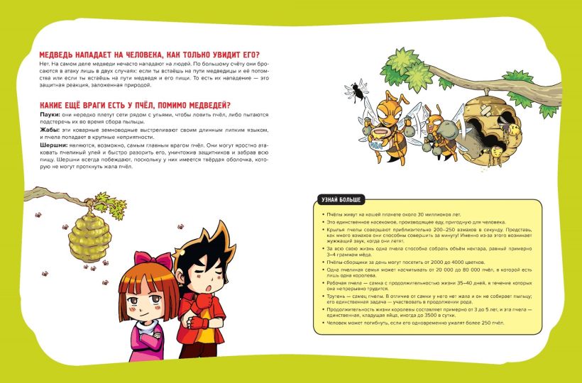 Каждая глава комикса дополнена интересными фактами о природе и науке. Вы узнаете о том, как производится мёд, какая еда препятствует воздействию обезболивающих, а также о ДНК, РНК и многом другом. Смешные картинки помогут запомнить не самую простую информацию.