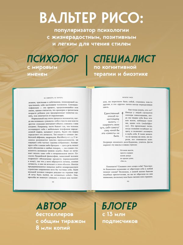 «Удивительно, но факт: чтобы идти вперед, нужно что-то отпустить. А мы с вами часто держимся за то, что нам давно не нужно. Эта книга — урок освобождения, усвоив который можно увидеть мир в еще более полной красоте. Вальтер Рисо показывает путь навстречу счастью, на каком бы этапе жизни вы сейчас ни находились». — Александра Яковлева, автор и ведущая подкаста «Психология с Александрой Яковлевой»