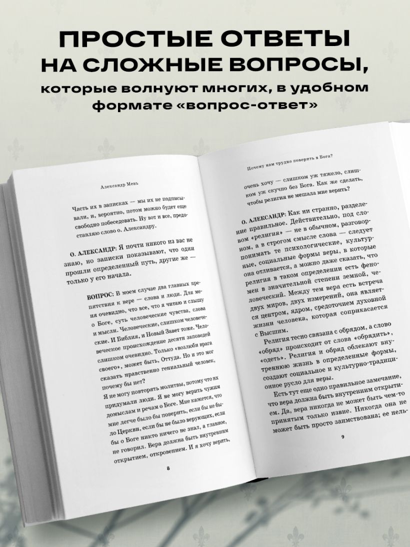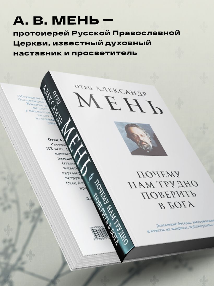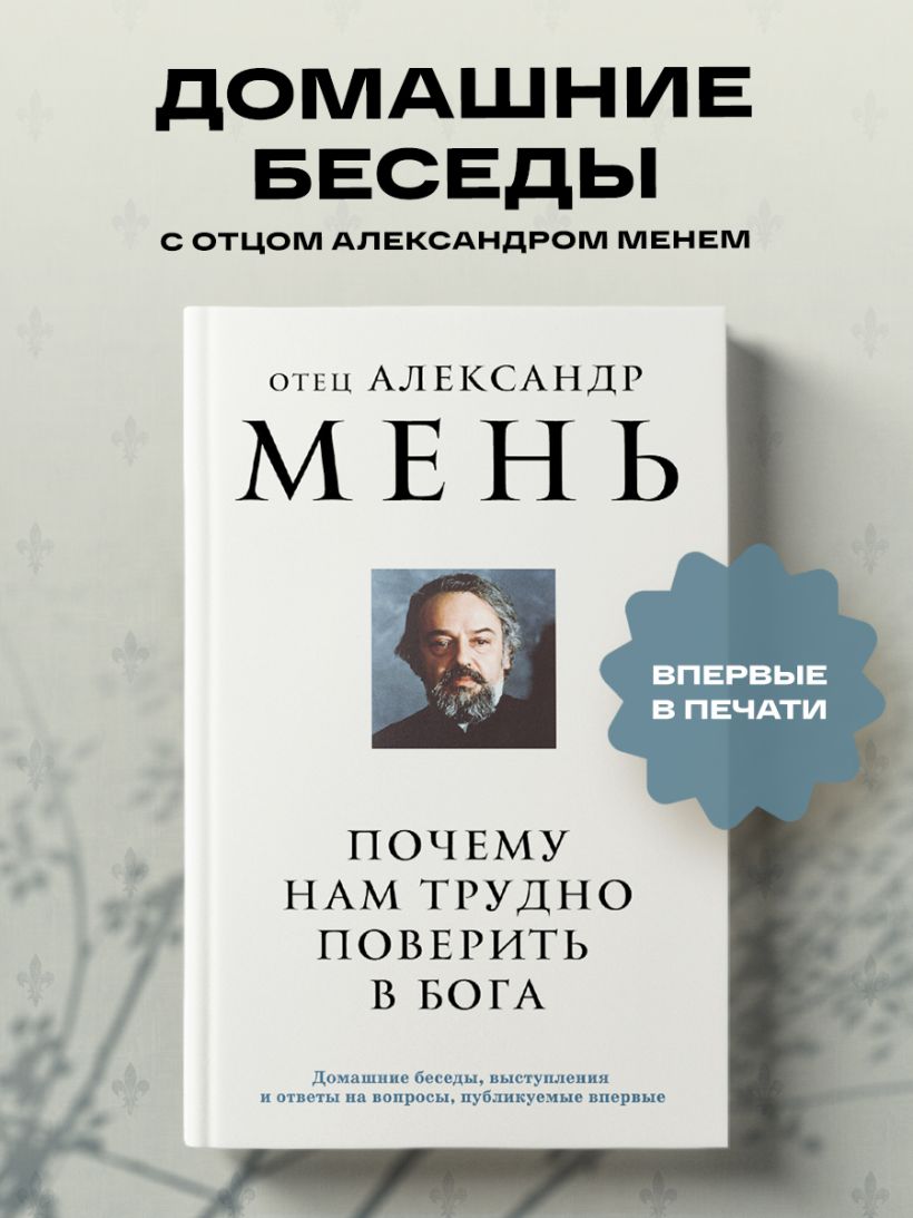 Александр Владимирович Мень — протоиерей Русской православной церкви, богослов, автор книг по богословию, истории христианства и других религий, основам христианского вероучения, православному богослужению. Книга «Почему нам трудно поверить в Бога» — подлинное наставление для тех, кто ищет путь и укрепление в вере, составленная в формате «вопрос-ответ». За основу взят текст беседы с о. Александром за круглым столом, который так и называется «Почему нам трудно поверить в Бога?». «Подсознательно верят все, — говорил он. — Подсознательно каждый из нас ощущает, что есть глубочайший смысл бытия. Наше существование и существование мира имеет с этим смыслом прямую связь. Разумно верующий человек — это тот, кто это ощущение выводит на уровень сознания». В своих книгах, лекциях, беседах он стремился максимально просто говорить о сложном, чтобы в человеке открылся чистый незамутненный источник, в котором бы отразилось Божественное, и чтобы он смог обрести в своей жизни присутствие «высшей духовной Реальности».