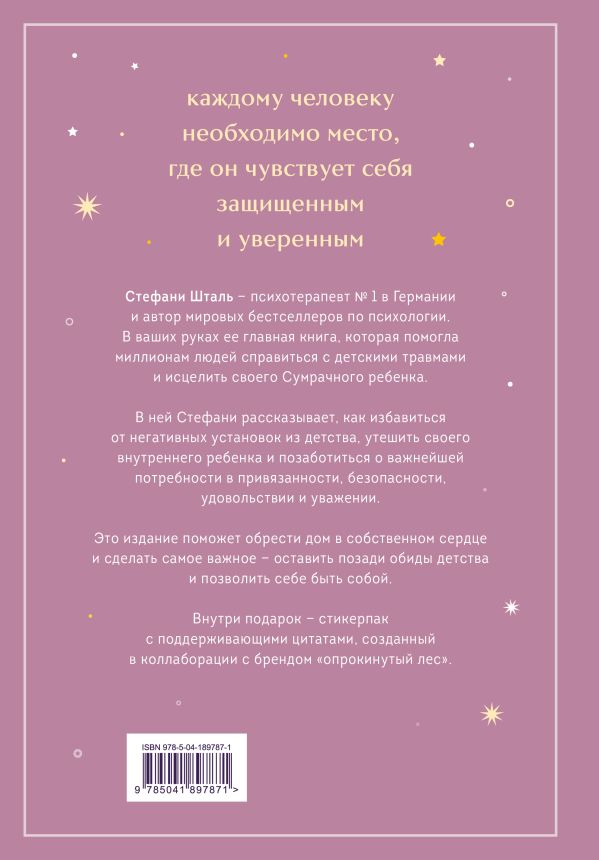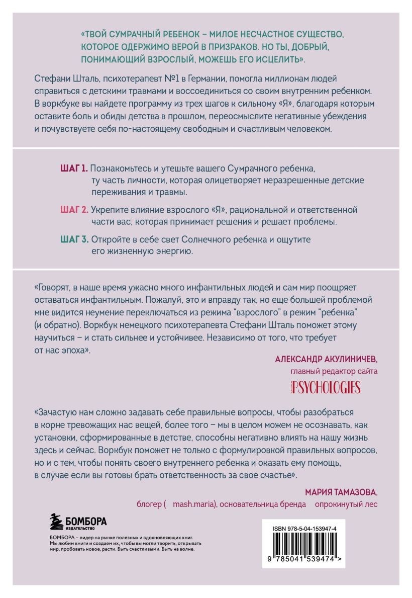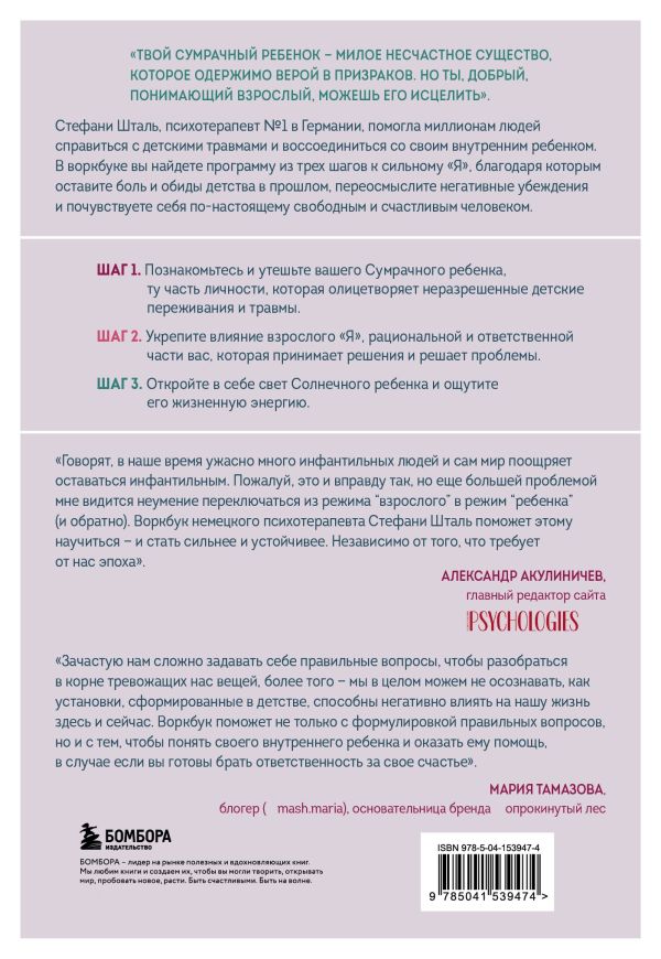 Стефани Шталь, психотерапевт № 1 в Германии, помогла миллионам людей по всему миру справиться с детскими травмами и воссоединиться со своим внутренним ребенком. Ее воркбук — программа из трех шагов к сильному «Я», благодаря которым вы оставите боль и обиды детства в прошлом, переосмыслите негативные убеждения и почувствуете себя по-настоящему свободным и счастливым человеком.