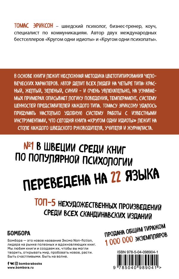 «Кругом одни идиоты. Скандинавский бестселлер по психологии общения». Книга является универсальной отмычкой к личности любого человека. Ее автор, знаменитый психолог Томас Эриксон, делит всех людей на четыре цветовых типа. Он объясняет, как с ними находить общий язык, вести проекты, разрешать конфликты и заводить партнерские отношения.