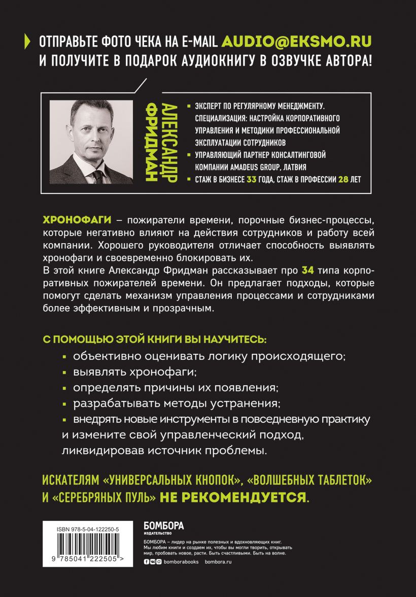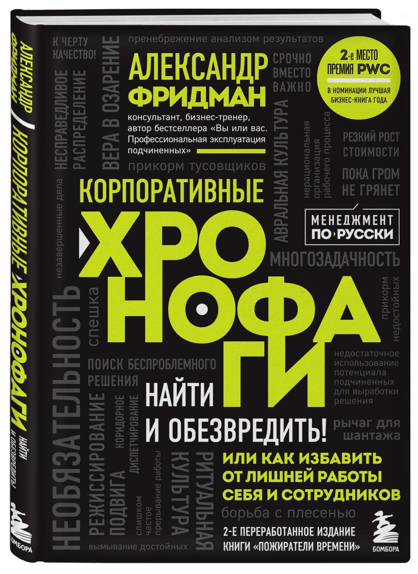 «Корпоративные хронофаги. Найти и обезвредить! Или как избавить от лишней работы себя и сотрудников» — эта книга рассказывает про 34 типа корпоративных пожирателей времени и предлагает подходы, которые помогут сделать механизм управления процессами и сотрудниками более эффективным и прозрачным.