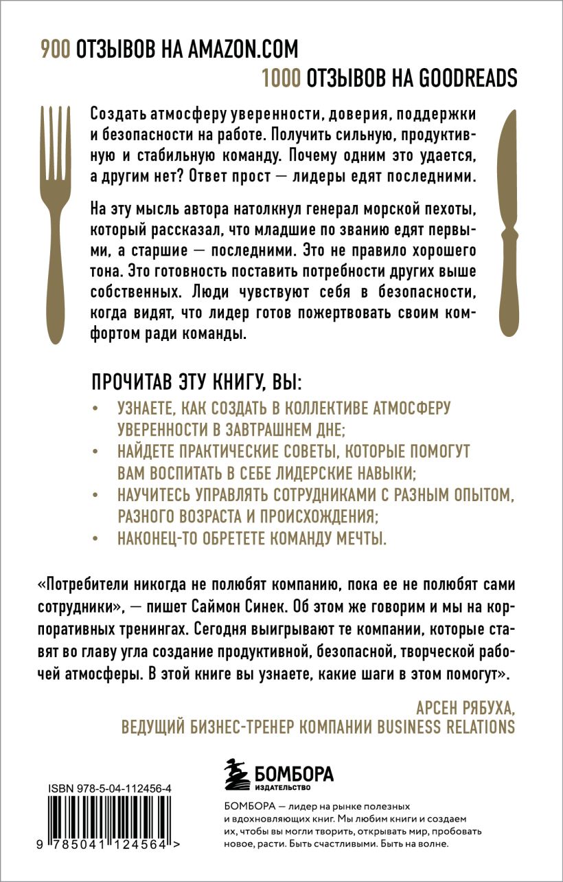"Лидеры едят последними: как создать команду мечты". Саймон Синек, автор бестселлера New York Times, бизнес-тренер и выдающийся спикер, отвечает на вопрос, как создать атмосферу, в которой легко воспитать команду уверенных в себе и довольных своей работой людей, готовых решать самые сложные задачи.