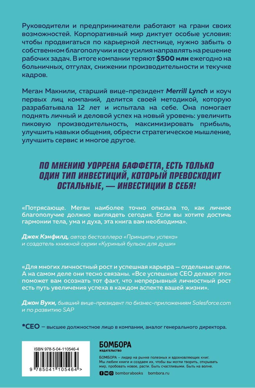 "Все успешные CEO делают это. Как брать от жизни все и добиваться феноменальных результатов в карьере". Меган Макнили, старший вице-президент из Merrill Lynch и коуч первых лиц компаний, делится своей методикой, благодаря которой вы, как руководитель, выйти на новый уровень: увеличить пиковую производительность, максимизировать прибыль, улучшить навыки общения и многое другое.