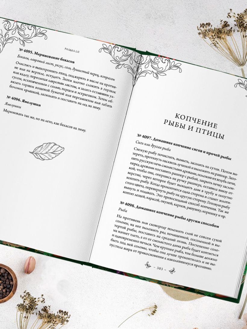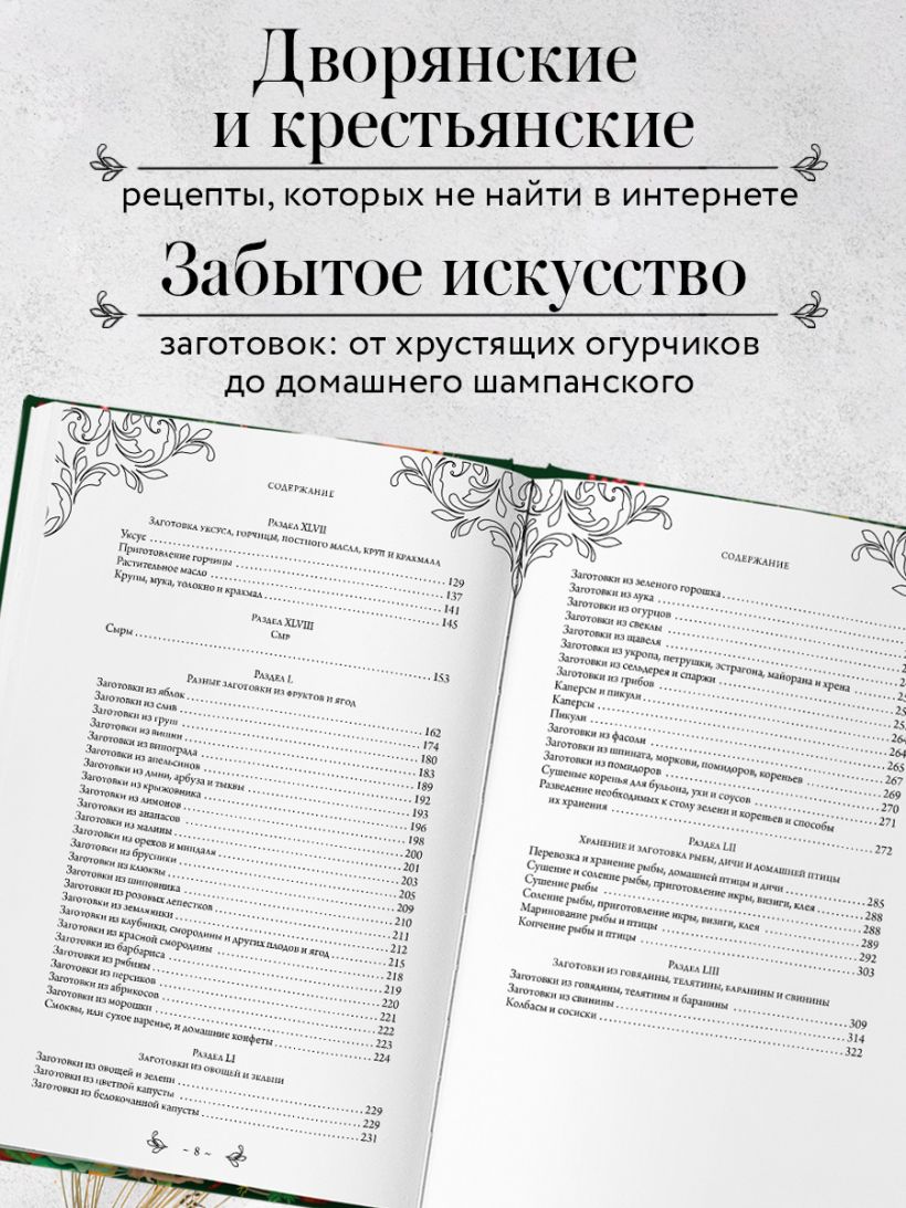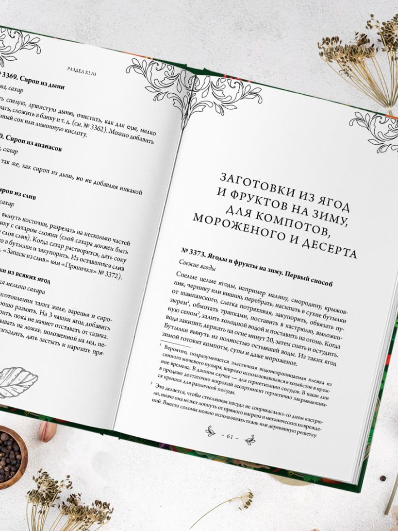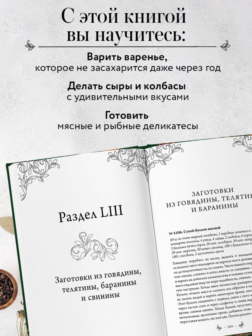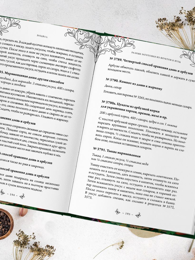 Здесь вы найдете рецепты заготовок овощей и фруктов, правила хранения и консервации рыбы и мяса, рецепты создания различных сыров и домашних напитков. Нумерация разделов и рецептов сохранена такой, какой она была в классическом издании.