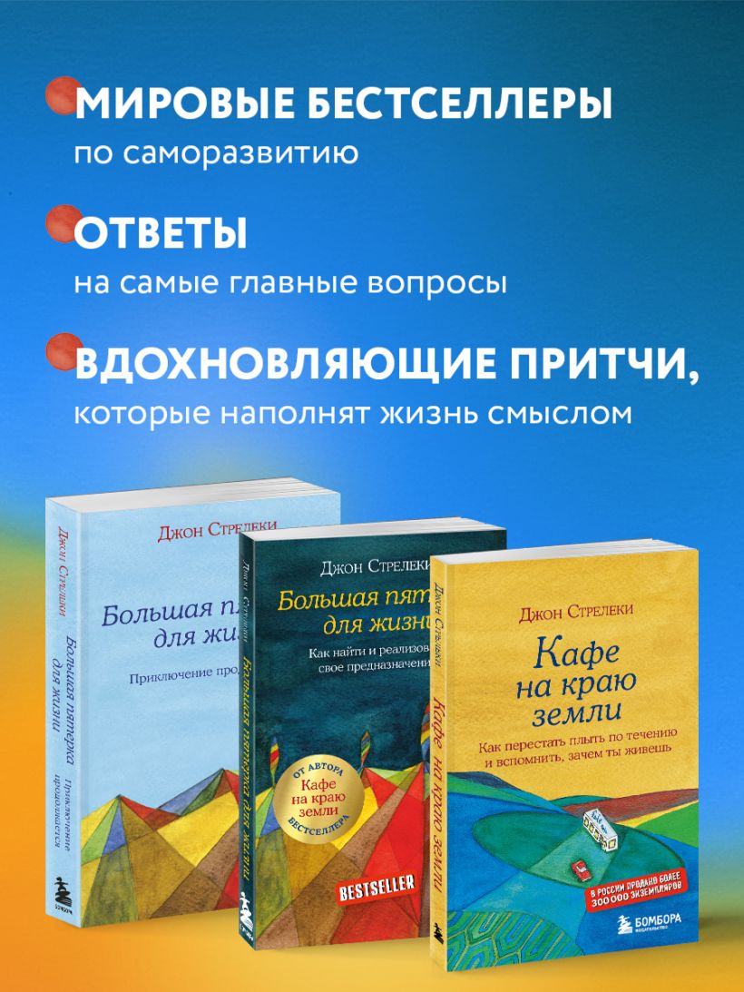 В повседневной суете мы с трудом понимаем, на что тратим время и силы, куда двигаемся и, самое главное, зачем. Нередко в такие моменты, когда меньше всего этого ожидаете (и, возможно, больше всего в этом нуждаетесь), вы вдруг оказываетесь в новом месте, с новыми людьми, находите помощь и учитесь чему-то новому. Эти три лучшие книги коуча и бизнес-консультанта Джона П. Стрелеки — тот самый навигатор, который выведет из ощущений потерянности и приведет к главным целям — вашей «Большой пятерке».