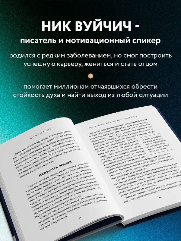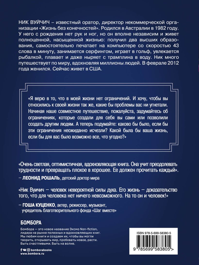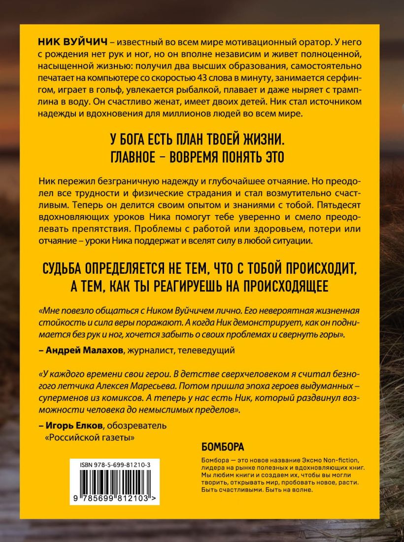 У каждого в жизни бывают моменты, когда «на сердце тяжесть и холодно в груди», когда проблемы захлестывают с головой и кажется, что нет выхода… В такие моменты нужен кто-то мудрый рядом – чтобы успокоить, дать совет и вселить надежду. Таким советчиком является эта книга. Ее написал знаменитый оратор-мориватор Ник Вуйчич, который хорошо знает, что такое глубочайшее отчаяние: он родился без рук и ног и пытался покончить жизнь самоубийством. Но Ник преодолел все трудности и физические страдания и стал, как он сам говорит, возмутительно счастливым. В этой книге Ник сформулировал 50 вдохновляющих уроков, которые помогут читателям уверенно и смело преодолевать все препятствия на жизненном пути. Проблемы с работой или здоровьем, потери или отчаяние - уроки Ника поддержат и вселят силу в любой ситуации.