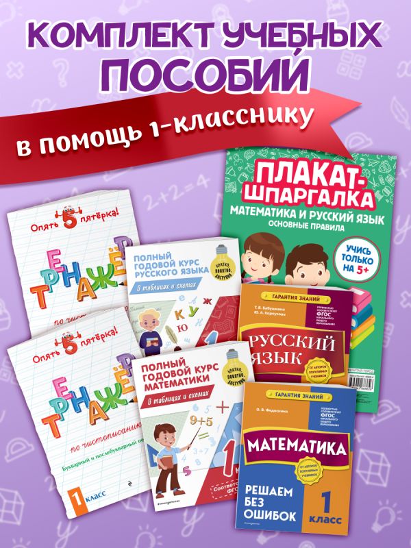 В комплект «Подарок первокласснику (6 книг + шпаргалка в подарок)» входят книги: «Тренажер по чистописанию. Добукварный период. 1 класс», «Тренажер по чистописанию. Букварный и послебукварный периоды. 1 класс», «Русский язык. 1 класс. Пишем без ошибок», «Математика. 1 класс. Решаем без ошибок», «Полный годовой курс математики в таблицах и схемах: 1 класс», «Полный годовой курс русского языка в таблицах и схемах: 1 класс», «Плакат-шпаргалка для начальной школы». Эти пособия направлены на то, чтобы помочь первокласснику в обучении по русскому языку и математике, позволяя детям познавать новое, закреплять пройденный материал в школе в интересной и классической форме. Набор книг от издательства «Эксмо» будет полезным подарком для мальчиков и девочек, поддерживая их интерес к обучению. А шпаргалка поможет легко и наглядно запомнить систематизированный материал. Занимаясь по предложенным пособиям, ребенок улучшит свои результаты и будет получать только хорошие и отличные оценки.