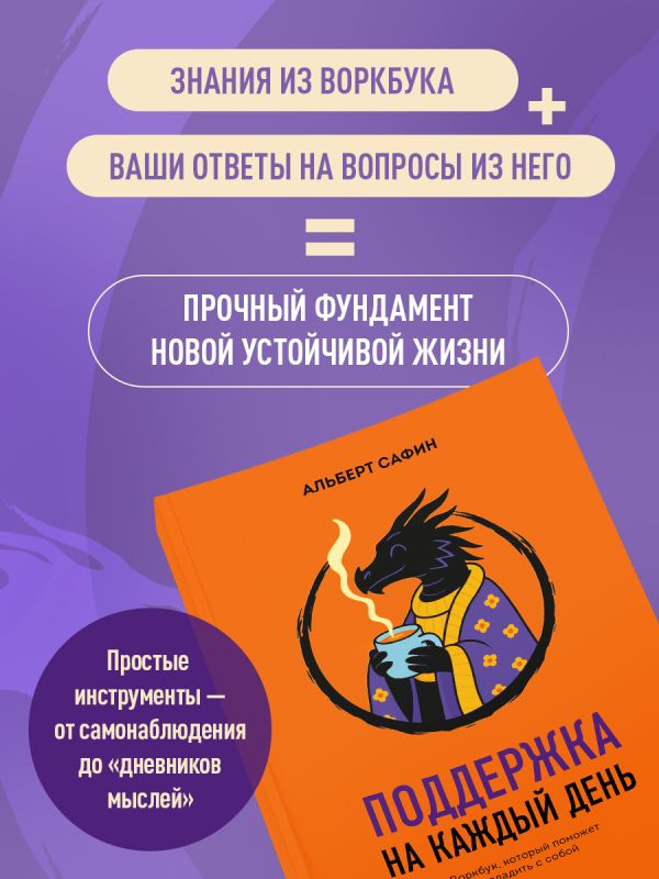 «Поддержка на каждый день» — это авторский воркбук, который поможет понять себя и свои чувства. Переходя от урока к уроку, вы научитесь быть себе лучшим другом, ловить SOS-сигналы от тела, укрощать свои тревожные состояния и превращать радость в привычку.