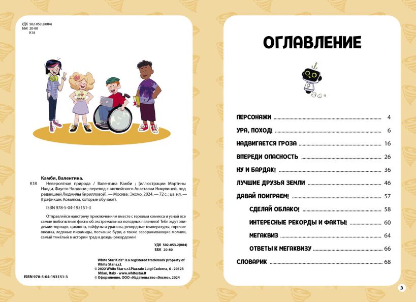 Тебя ждут рекордные температуры, горячие океаны, ледяные пирамиды, песчаные бури, завораживающие молнии, тяжелейший в истории град, дождь-рекордсмен и самый большой вихрь Солнечной системы! А также захватывающий сюжет, море научных фактов и красочные иллюстрации.