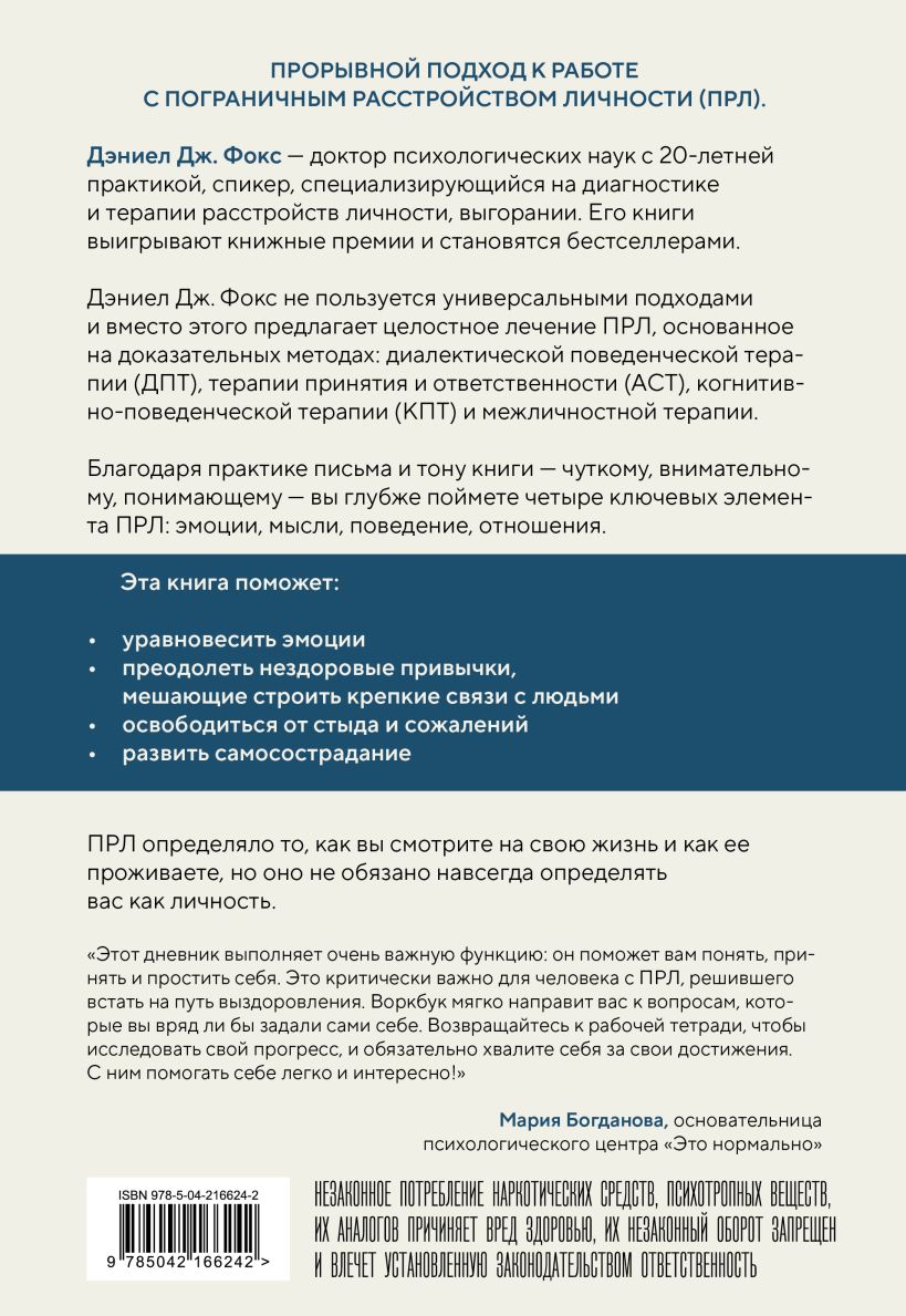 «Этот дневник выполняет очень важную функцию: он поможет вам понять, принять и простить себя. Это критически важно для человека с ПРЛ, решившего встать на путь выздоровления. Воркбук мягко направит вас к вопросам, которые вы вряд ли бы задали сами себе. Возвращайтесь к рабочей тетради, чтобы исследовать свой прогресс, и обязательно хвалите себя за свои достижения. С ним помогать себе легко и интересно!» — Мария Богданова, основательница психологического центра «Это нормально»