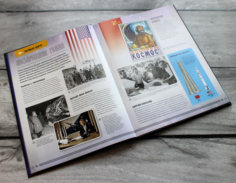Рука об руку с пионерами космонавтики ты пройдёшь весь путь от самых первых прототипов ракет до современных космических кораблей, побываешь на каждой планете Солнечной системы и их спутниках и заглянешь в далёкие уголки Вселенной. И всё это — не выходя из дома, благодаря многочисленным иллюстрациям и фотографиям от НАСА и ЕКА, а также снимкам с телескопа «Хаббл».