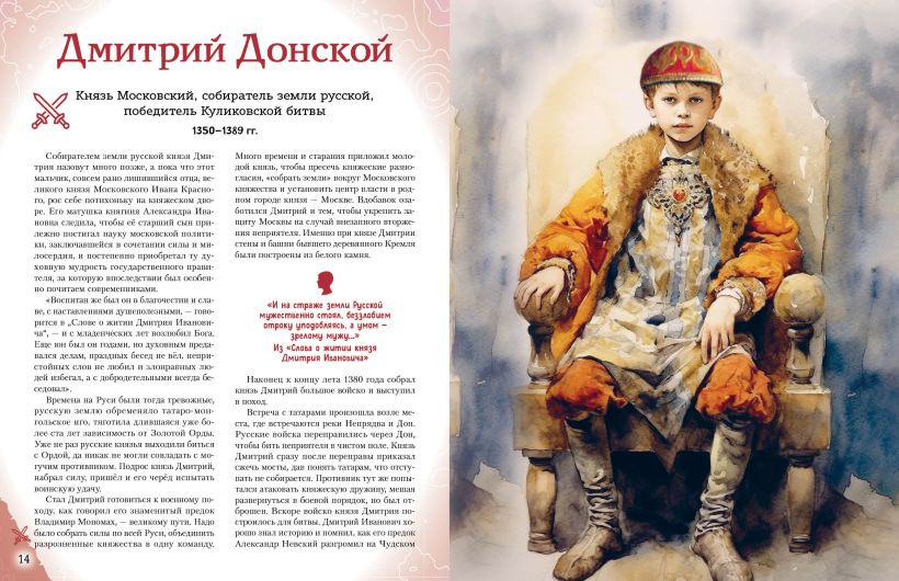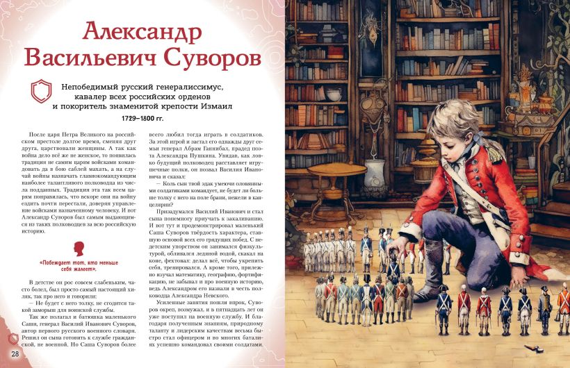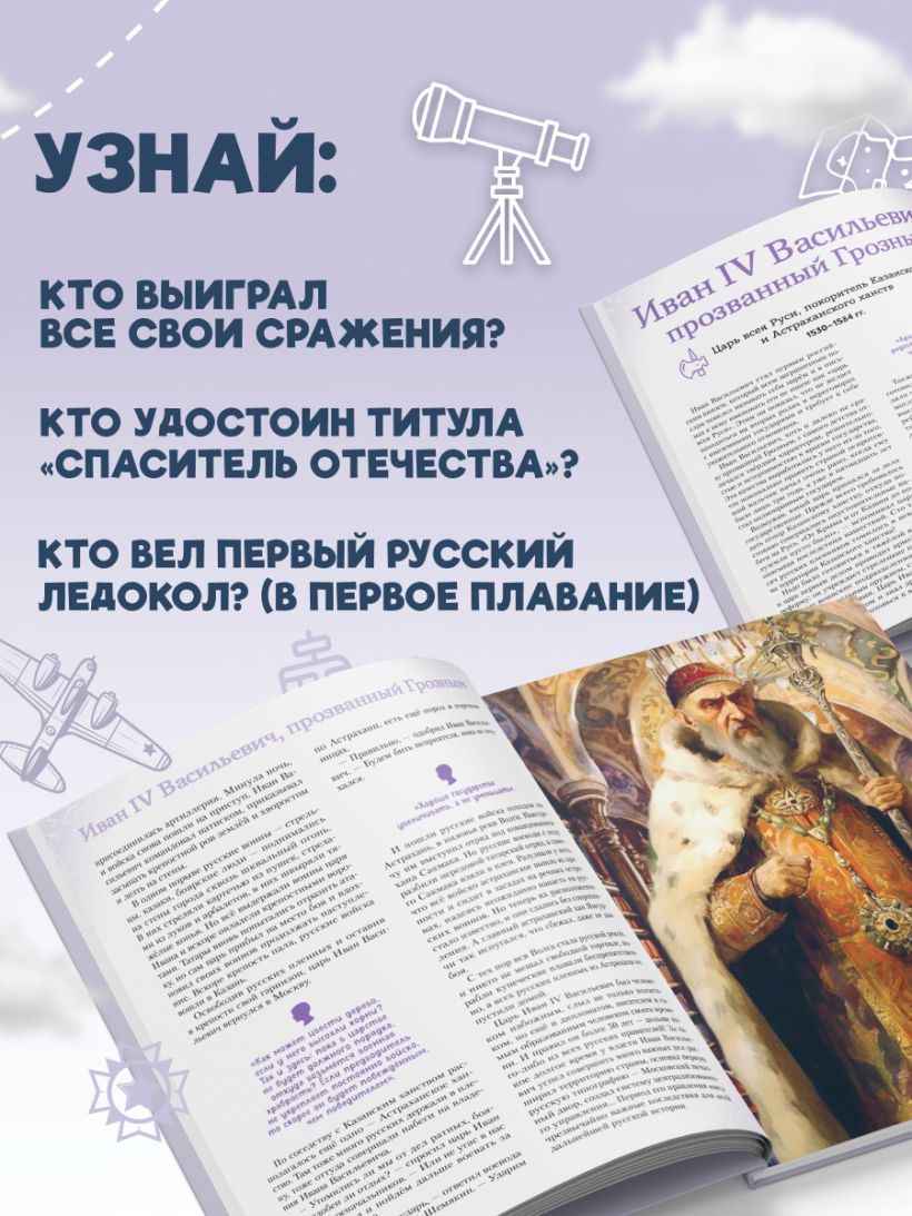 Отправляйтесь в захватывающее путешествие по разным эпохам нашей страны! Вы хотите познакомить вашего ребёнка с известными людьми России — Петром I и Суворовым, Пушкиным и Чайковским, Ломоносовым и Гагариным? Узнать, во что играли будущие исторические личности? Чем увлекались в детстве? Как искали свою судьбу, искали себя на нелёгких жизненных дорогах? Ведь они так же, как и все мы, одолевали за партой неподдающиеся науки, отстаивали собственное мнение в спорах; у них были свои детские огорчения и радости. И далеко не всё получалось с первого раза... Тогда открывайте эту книгу! В каждом из 20 биографических рассказов, адаптированных для детей 7—10 лет, — невероятный образец силы воли и стойкости характера, мотивирующий ребят на собственные свершения. Их сопровождают красочные полосные иллюстрации и занимательные факты, чтобы знакомиться с выдающимися соотечественниками было наглядно и увлекательно. А ещё это неповторимый подарок для всех, кто гордится историей и культурой своего Отечества! Книги серии получили заслуженно высокую оценку — в 2024 году они были номинированы на премию Российского общества «Знание» в категории «Лучшая просветительская книга».