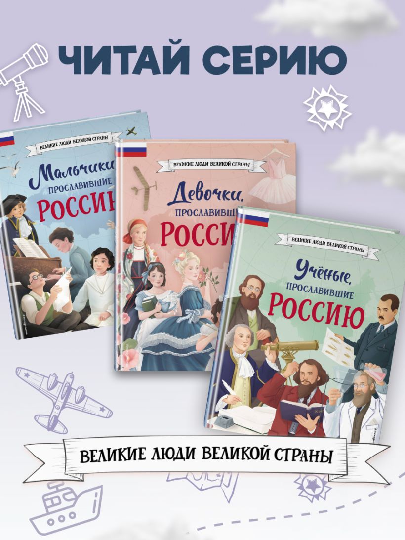 Отправляйтесь в захватывающее путешествие по разным эпохам нашей страны! Вы хотите познакомить вашего ребёнка с известными людьми России — княгиней Ольгой и Екатериной Дашковой, Галиной Вишневской и Мариной Цветаевой, Анной Павловой и Валентиной Терешковой? Узнать, во что играли будущие исторические личности? Чем увлекались в детстве? Как искали свою судьбу, искали себя на нелёгких жизненных дорогах? Ведь они так же, как и все мы, одолевали за партой неподдающиеся науки, отстаивали собственное мнение в спорах; у них были свои детские огорчения и радости. И далеко не всё получалось с первого раза... Тогда открывайте эту книгу! В каждом из 20 биографических рассказов, адаптированных для детей 7—10 лет, — невероятный образец силы воли и стойкости характера, мотивирующий девочек на собственные свершения. Их сопровождают красочные полосные иллюстрации и занимательные факты, чтобы знакомиться с выдающимися соотечественниками было наглядно и увлекательно. А ещё это неповторимый подарок для всех, кто гордится историей и культурой своего Отечества! Книги серии получили заслуженно высокую оценку — в 2024 году они были номинированы на премию Российского общества «Знание» в категории «Лучшая просветительская книга».