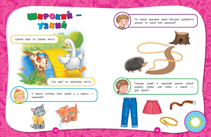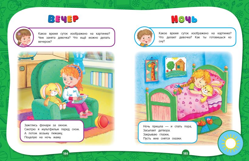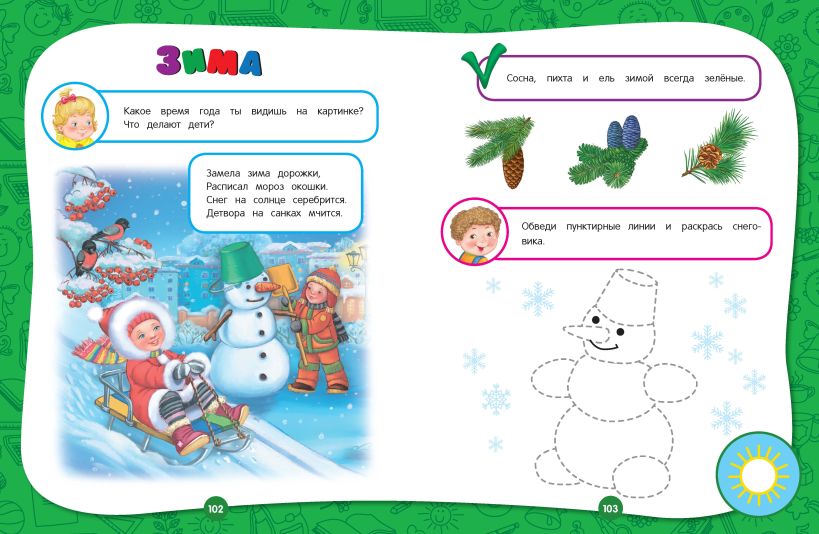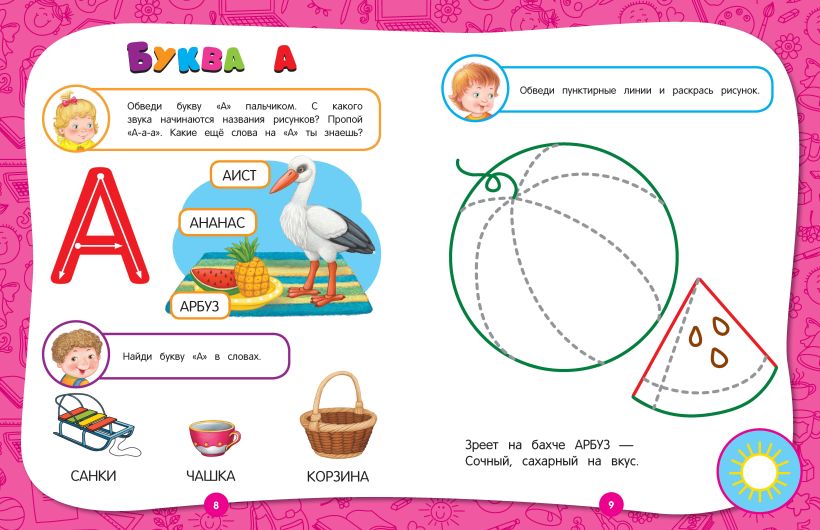 Она состоит из 17 разделов и заканчивается проверочными заданиями. Занимаясь, малыш выучит буквы и цифры, разовьет моторику, внимание, память, мышление, речь, научится различать времена года и части суток, узнает много нового о животных, сделает первые аппликации. В конце каждого занятия ребенок должен оценить свою работу — раскрасить солнышко, если справился с заданием, и половину солнышка, если допустил ошибки или попросил помощи взрослого. Это позволяет развивать ответственность и самостоятельность у малыша.